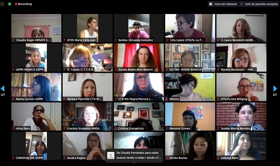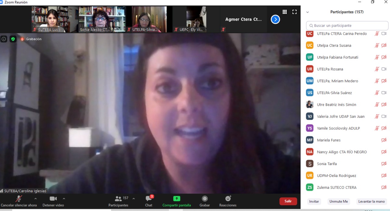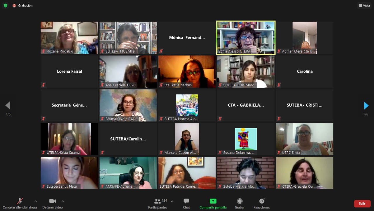 En el mismo, las panelistas fueron: Sonia Alesso, Secretaria General de la CTERA y miembro del Comité Ejecutivo Mundial de la IE; Estela Díaz, Ministra de las Mujeres, Políticas de Género y Diversidad Sexual de la provincia de Buenos Aires; Fátima Silva, CNTE - Brasil, Vicepresidenta del Comité Regional de la IEAL; Ana Carcedo, activista feminista e Investigadora de CEFEMINA Costa Rica; y Yamile Socolovsky, de la CONADU y Secretaria Nacional de Formación e Investigación de la CTA. Como moderadora participó Roxana Rogalski, Secretaria de Género e Igualdad de Oportunidades de la CTERA.