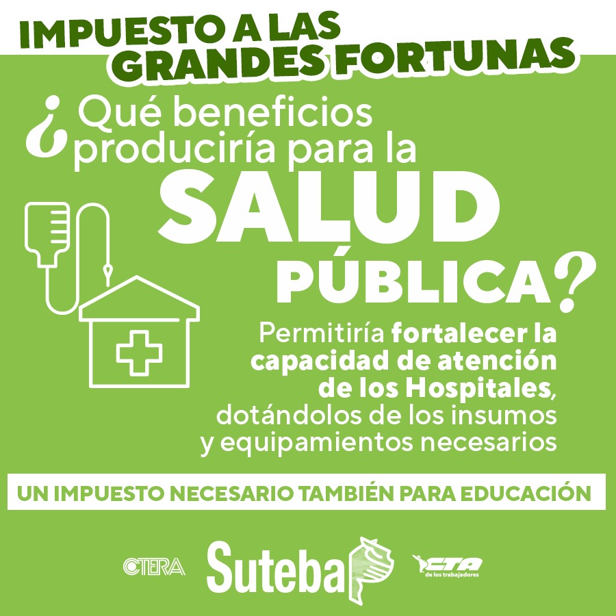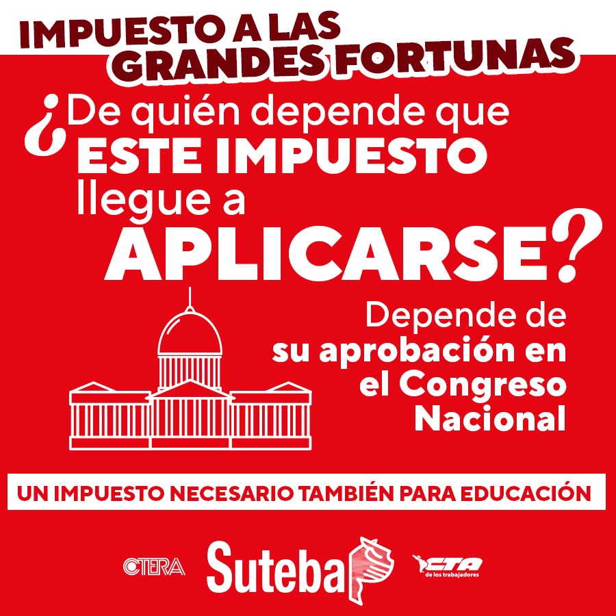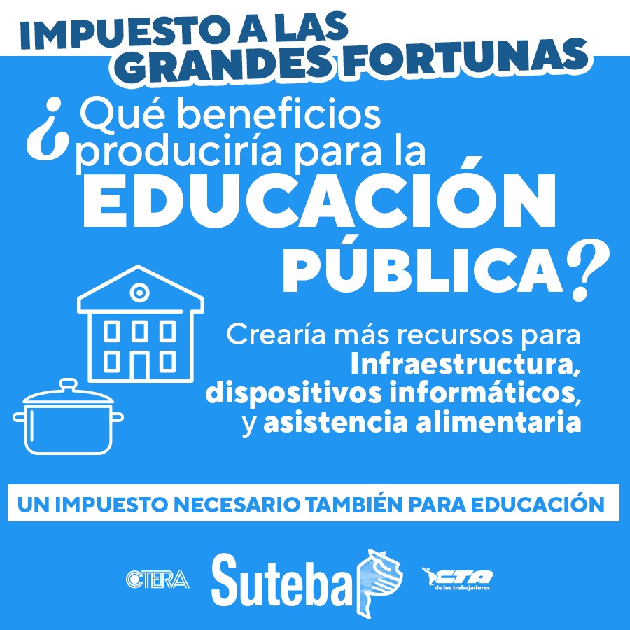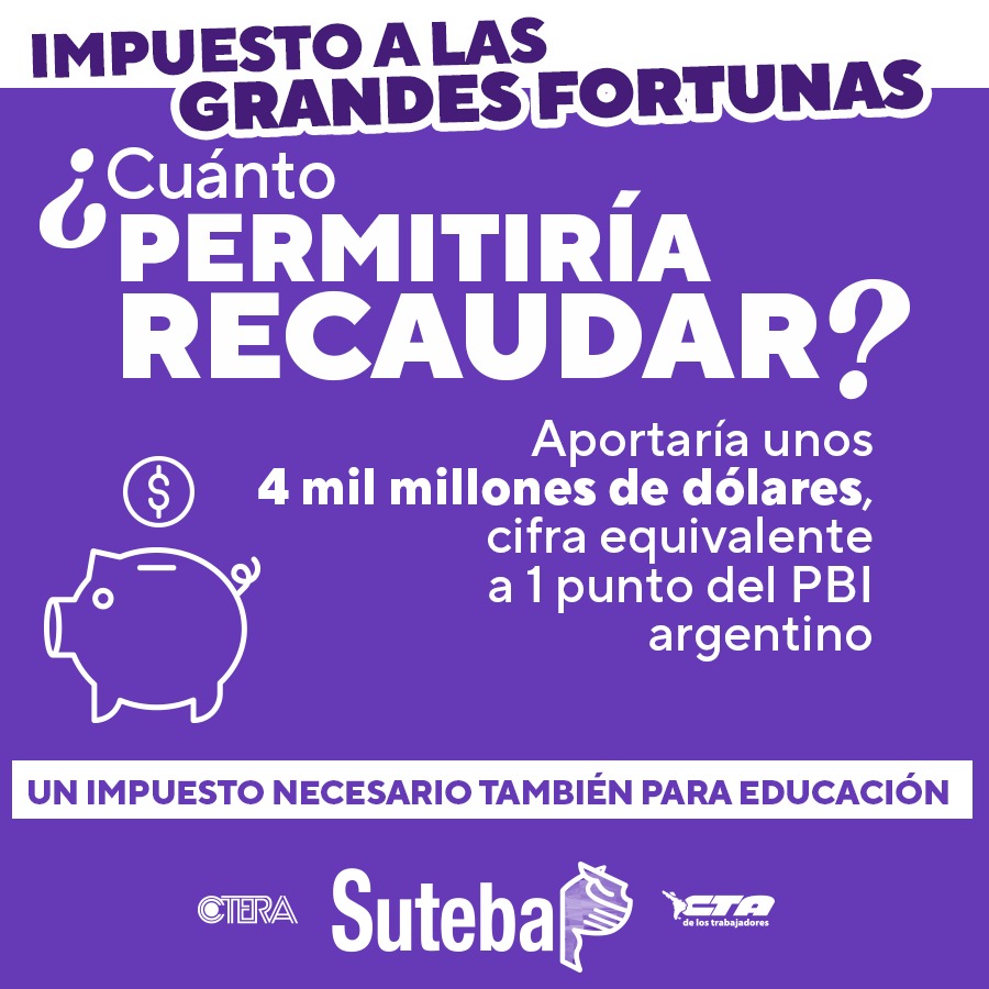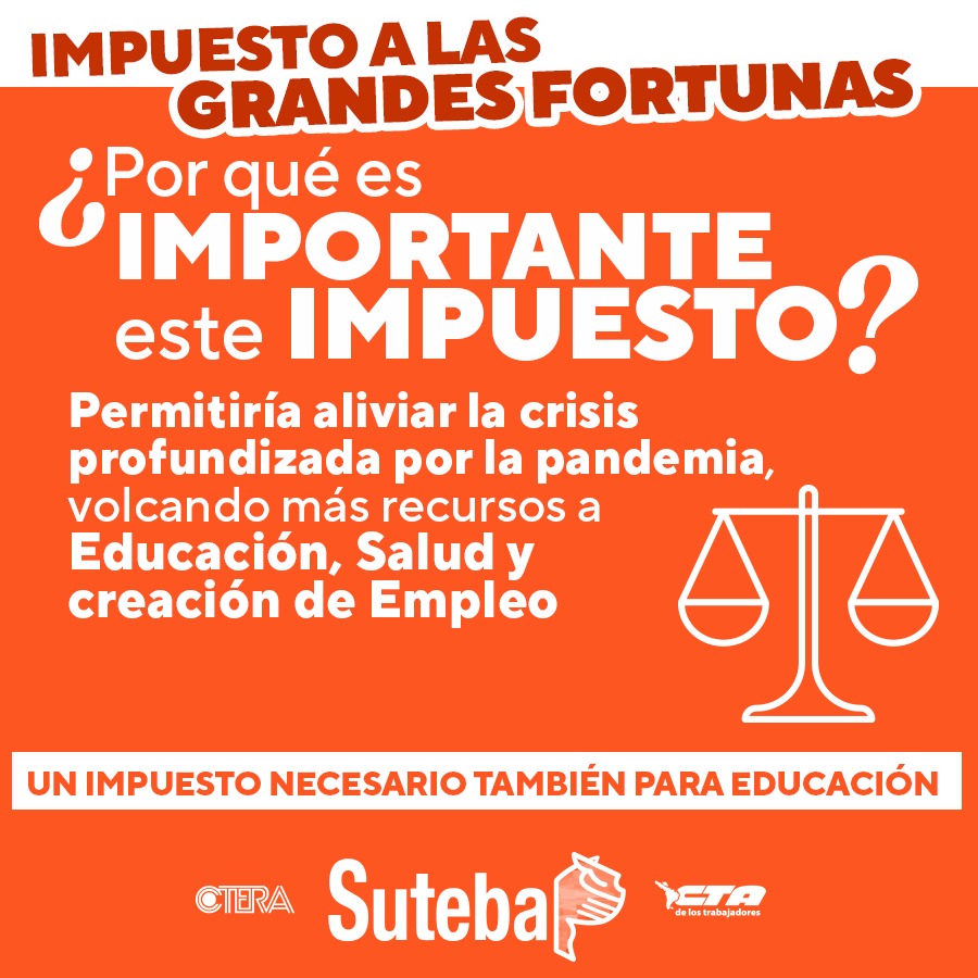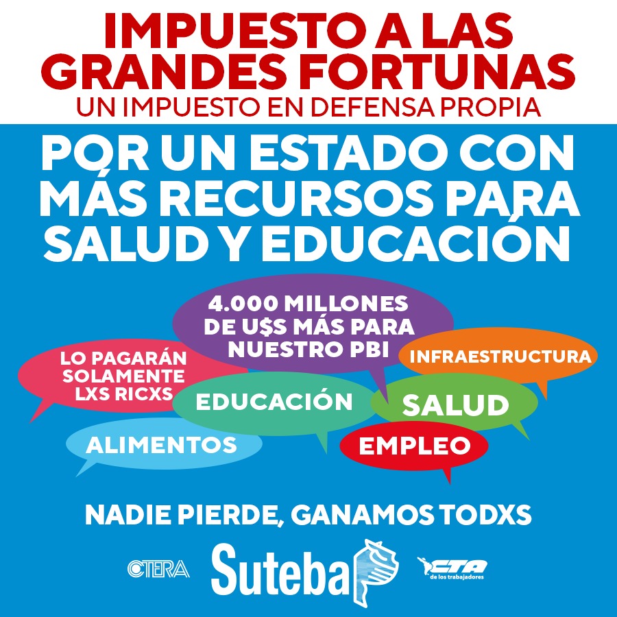 Enmarcadxs a nivel nacional dentro de la CTERA y la CTA de lxs Trabajadorxs, desde el SUTEBA expresamos nuestro total apoyo a la necesidad de que exista el Impuesto a las Grandes Fortunas. Sostenemos que este un Impuesto necesario y justo que permitiría aumentar las inversiones en políticas públicas (Educación, Salud, creación de Empleo, etc.) y achicar la desigualdad estructural que se profundizó durante los últimos años y que hoy se encrudece en el marco de la pandemia por el COVID-19.