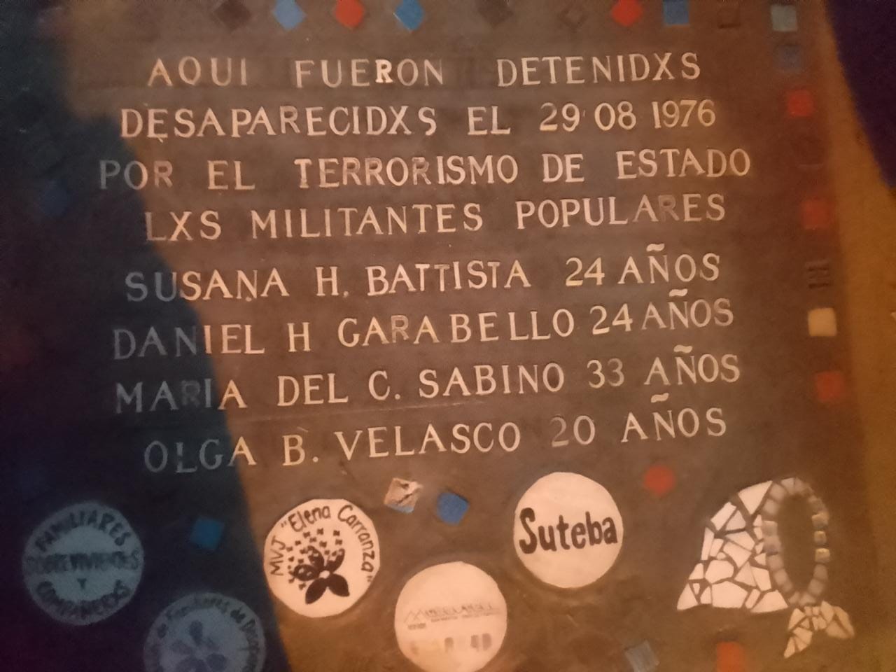 El lunes 29 de agosto, a 46 años de la desaparición de lxs compañerxs Olga Velazco, Daniel Garabello, María del Carmen Sabino y Susana Battista en la estación de tren del Ferrocarril Urquiza "El Tropezón", San Martín, a manos de la dictadura genocida, se realizó un acto en dicha localidad para homenajear a lxs compañerxs.
