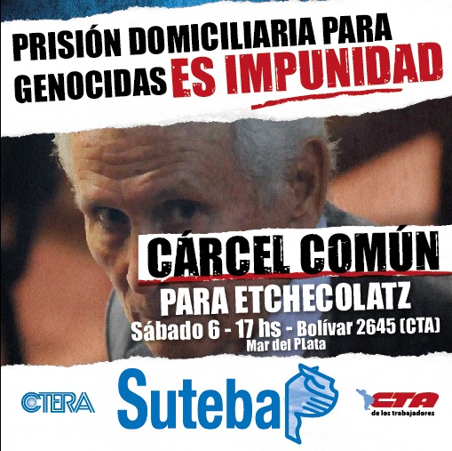Todxs lxs que conformamos SUTEBA este sábado, en Mar del Plata, tenemos una cita contra la impunidad. Concentramos a las 17 hs en CTA (Bolívar 2645) y de allí marchamos hasta el TOF 1 (Luro y Santiago del Estero) para finalizar en la Rambla.