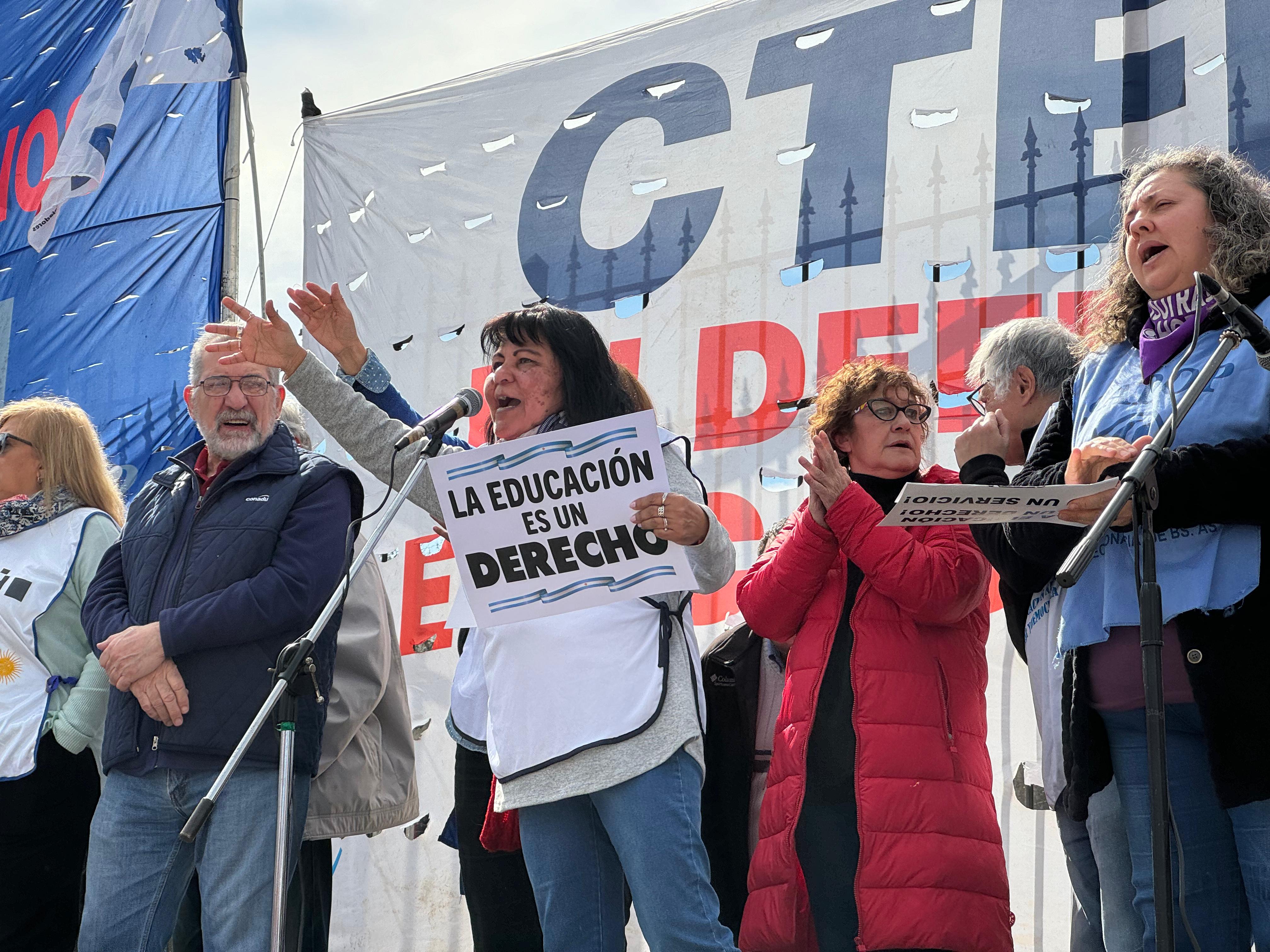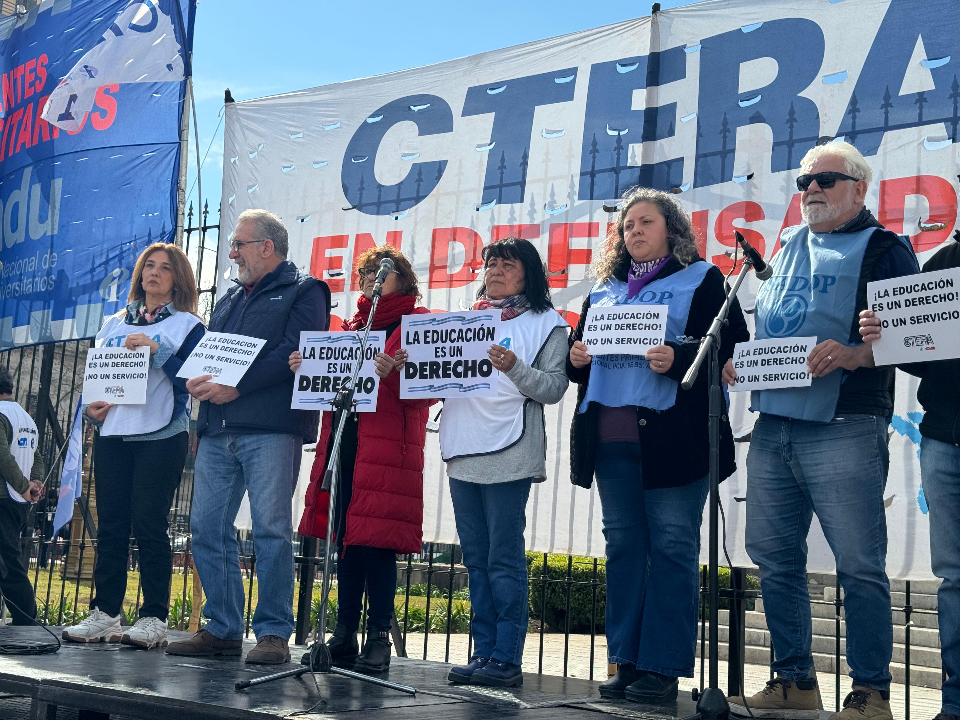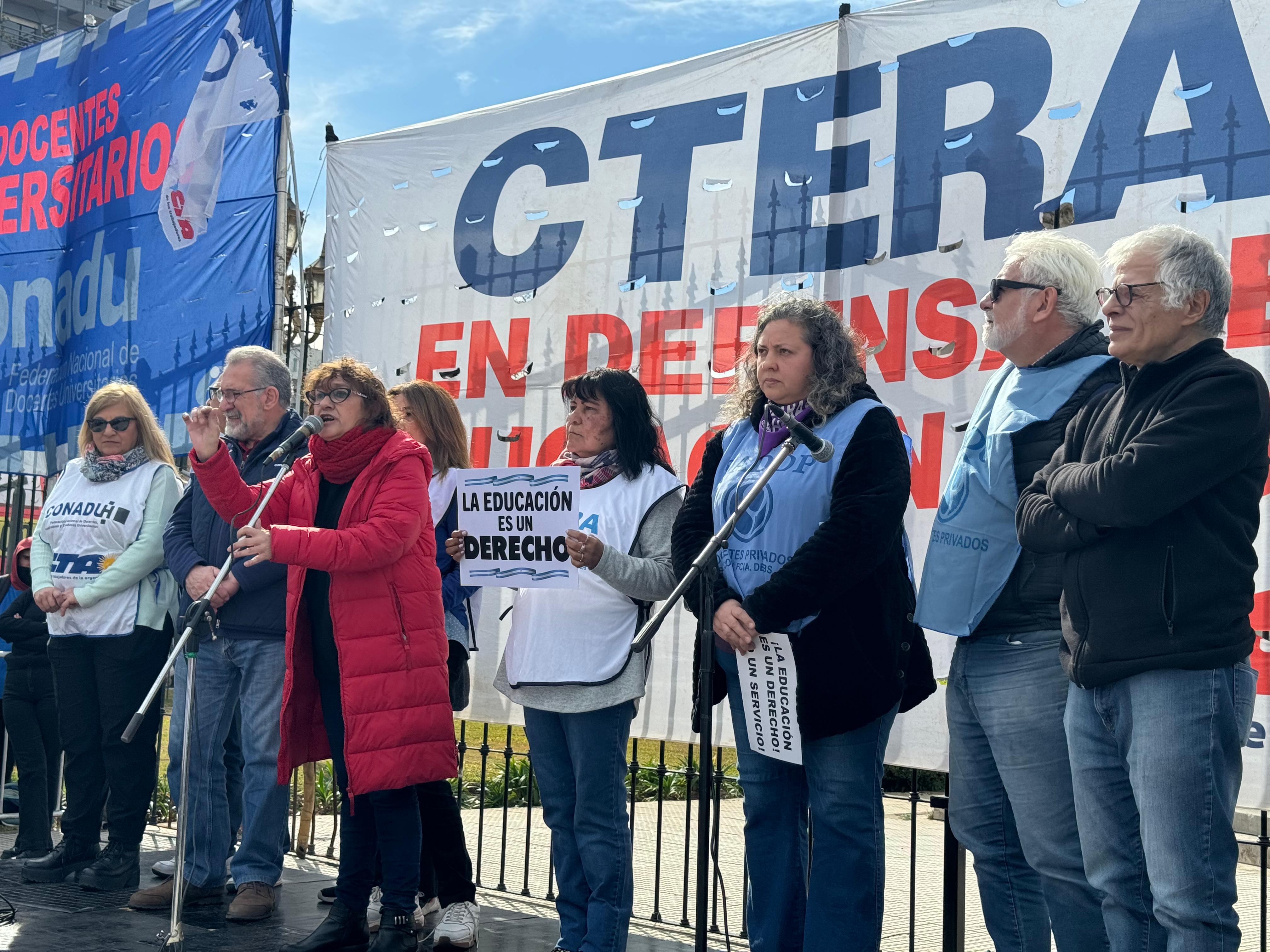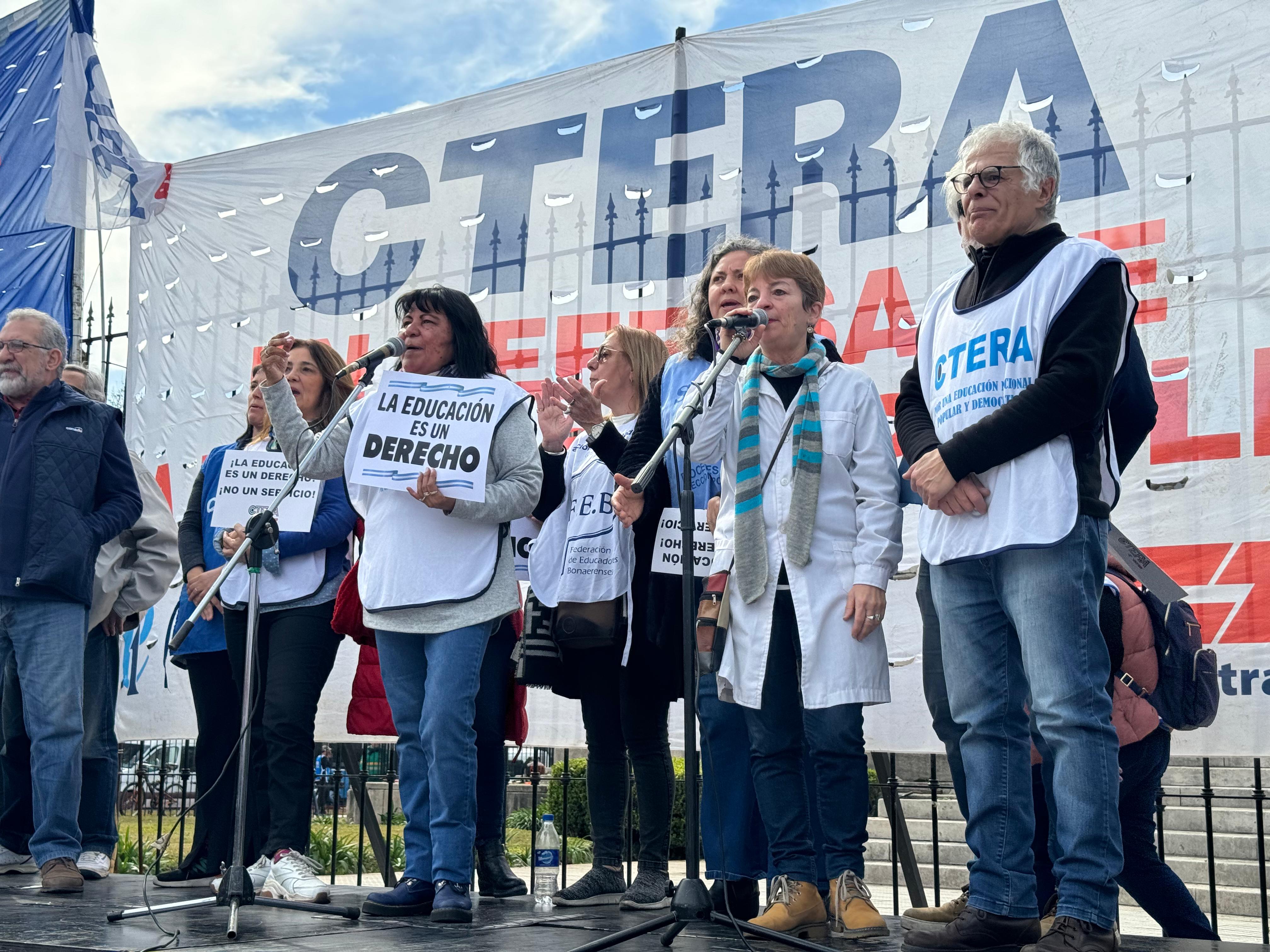 Sonia Alesso, Secretaria General de la CTERA, manifestó en el escenario: "El proyecto político del hambre, la miseria y la entrega del patrimonio nacional quiere convertir a la Educación en una mercancía. Para la CTERA, para los Sindicatos docentes de todo el país, para los gremios docentes que estamos en la Paritaria, para lxs universitarixs, la Educación, desde la más temprana infancia hasta la Universidad, es un derecho de todo el Pueblo argentino. Esta es una pelea de todas las Comunidades, de todo el país. Y es una pelea de unidad, de organización y de la construcción de la gran Marcha Federal Educativa".