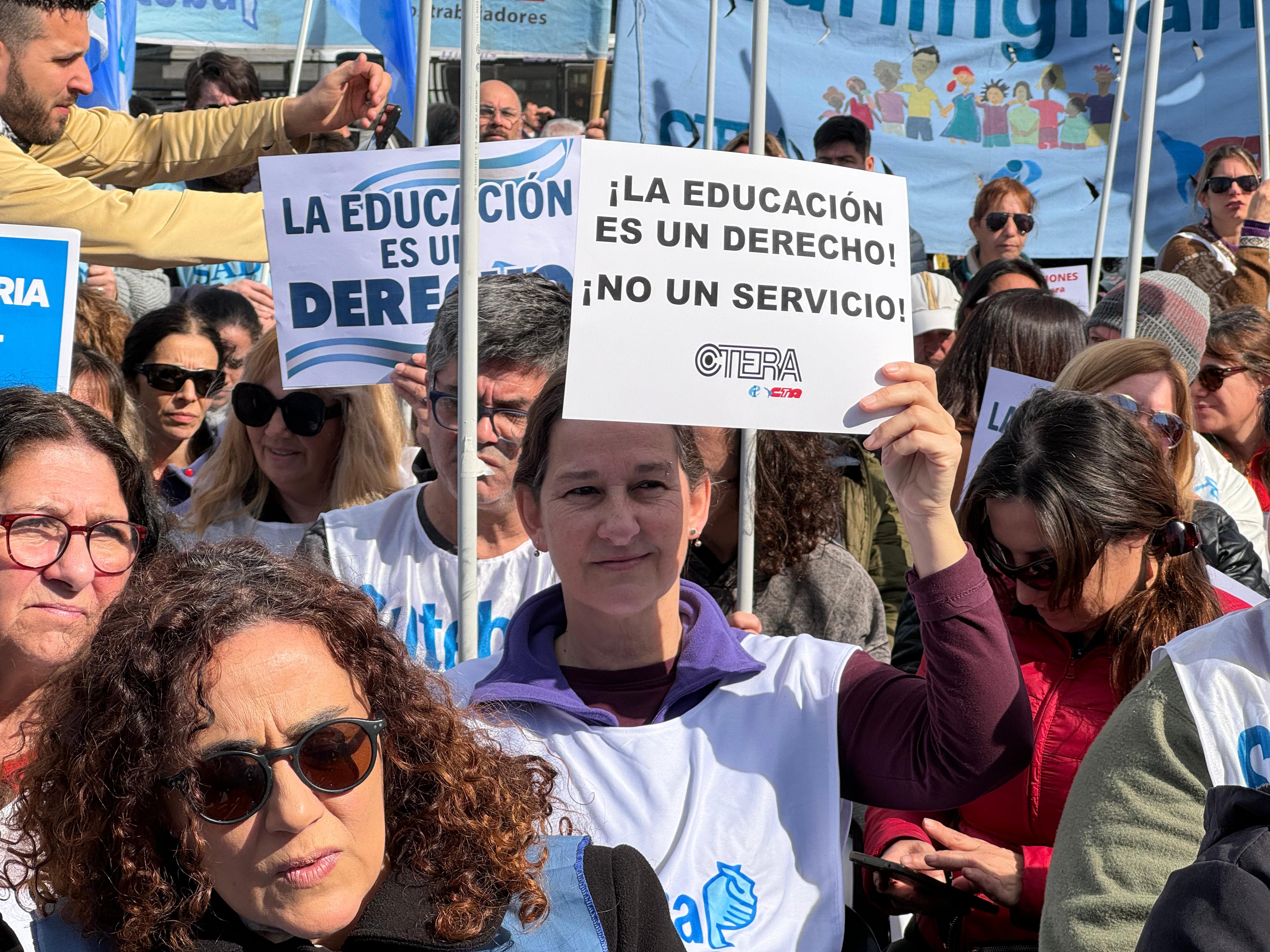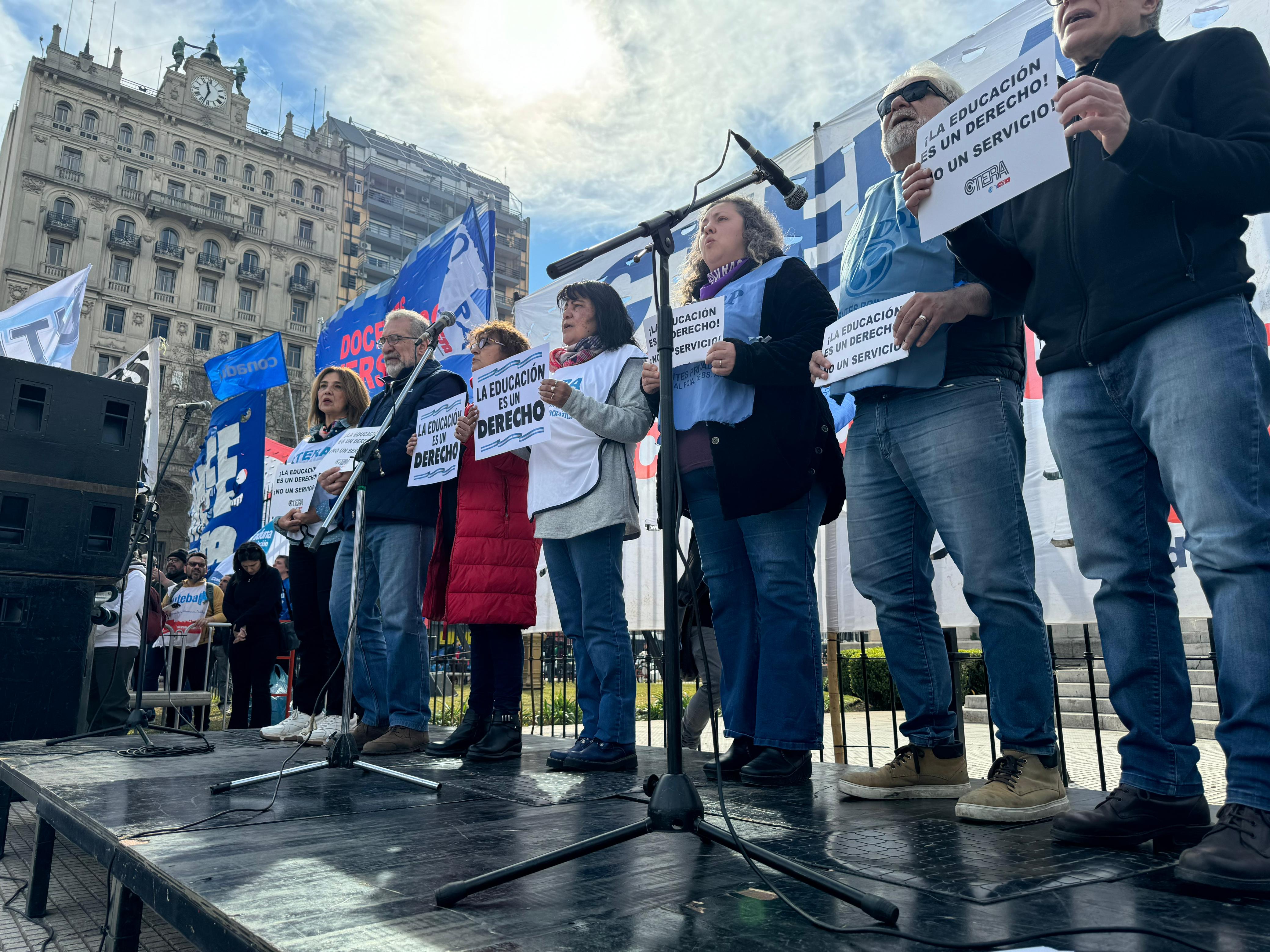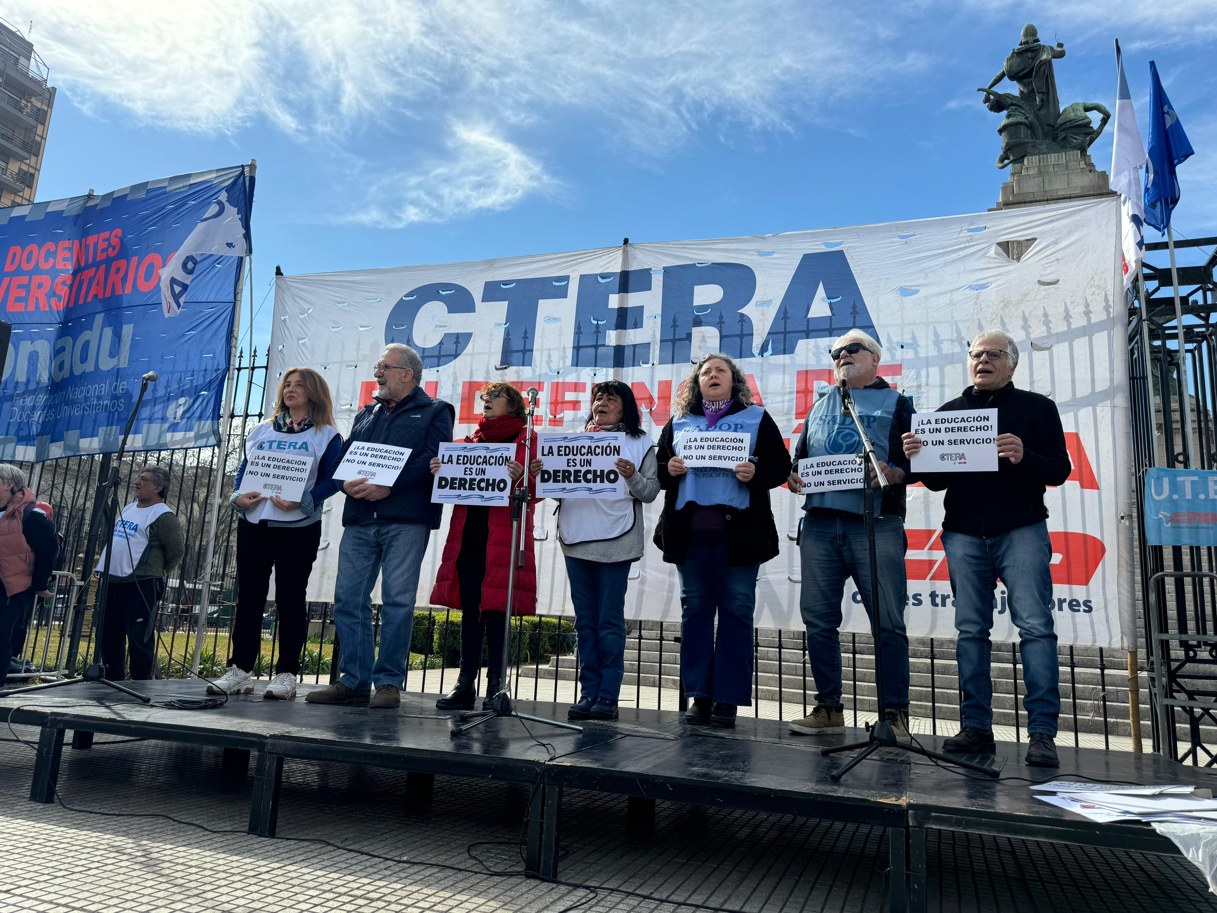 Sonia Alesso, Secretaria General de la CTERA, manifestó en el escenario: "El proyecto político del hambre, la miseria y la entrega del patrimonio nacional quiere convertir a la Educación en una mercancía. Para la CTERA, para los Sindicatos docentes de todo el país, para los gremios docentes que estamos en la Paritaria, para lxs universitarixs, la Educación, desde la más temprana infancia hasta la Universidad, es un derecho de todo el Pueblo argentino. Esta es una pelea de todas las Comunidades, de todo el país. Y es una pelea de unidad, de organización y de la construcción de la gran Marcha Federal Educativa".