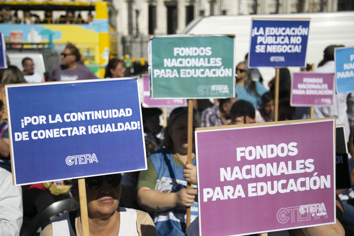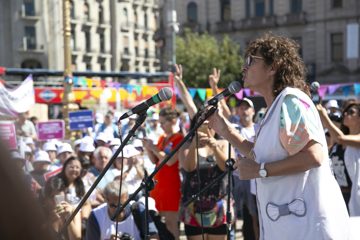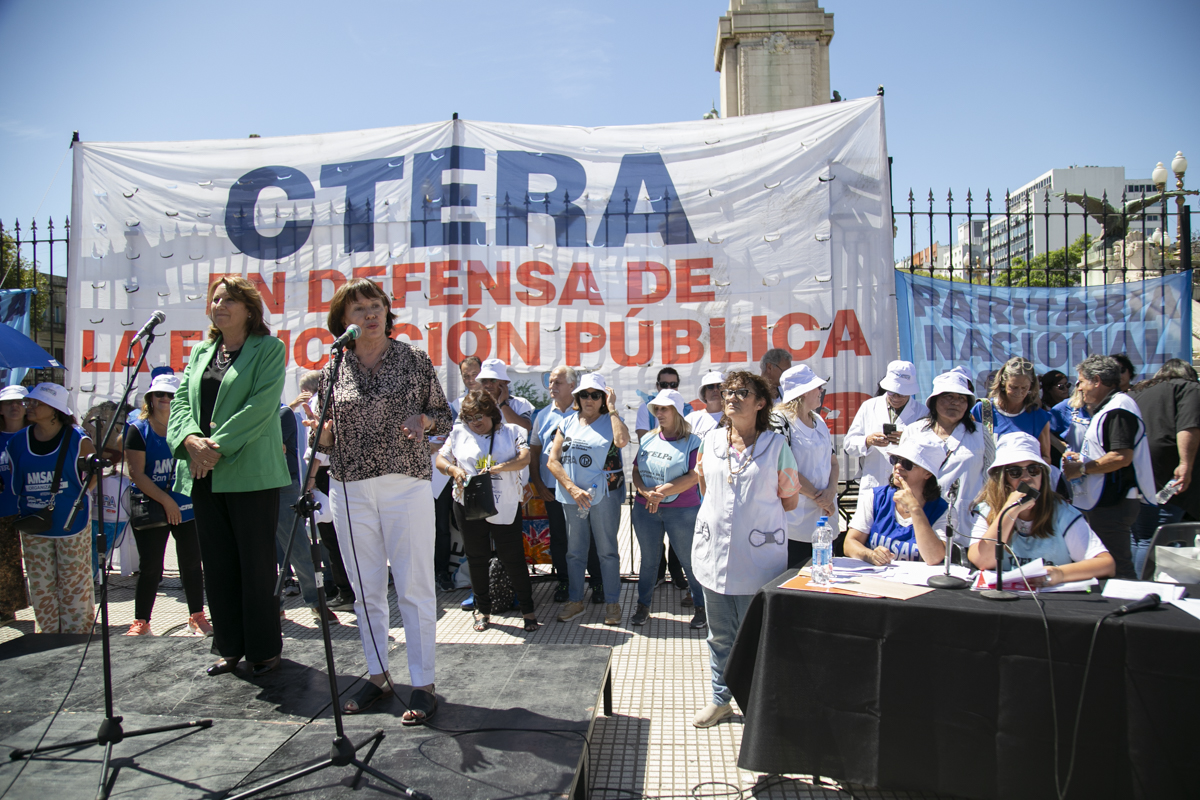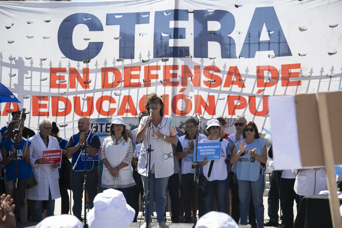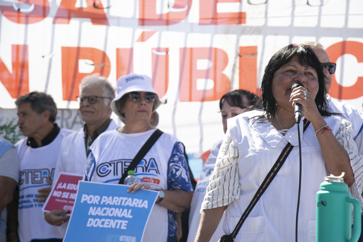 Sonia Alesso, Secretaria General de la CTERA: "La noticia de hoy es la del Decreto que sacaron reconociendo que van a enviar los fondos para la 5ta hora, la jornada extendida y la jornada completa. Van a mandar los fondos para Comedor y copa de leche que estaban pendientes, y que van a mandar el Fondo Compensador. Nos falta el FONID, que lo conseguimos acá, en este mismo lugar, donde estuvo la Carpa Blanca. Nos quieren arrebatar, no solo una parte de nuestro salario, sino una conquista histórica.