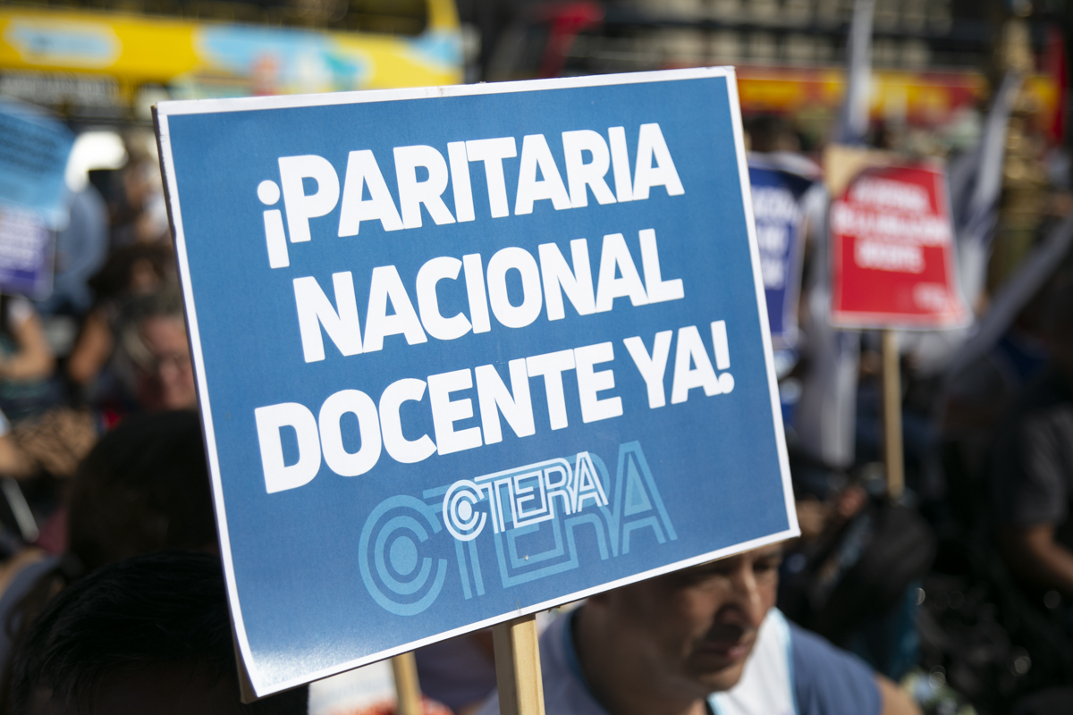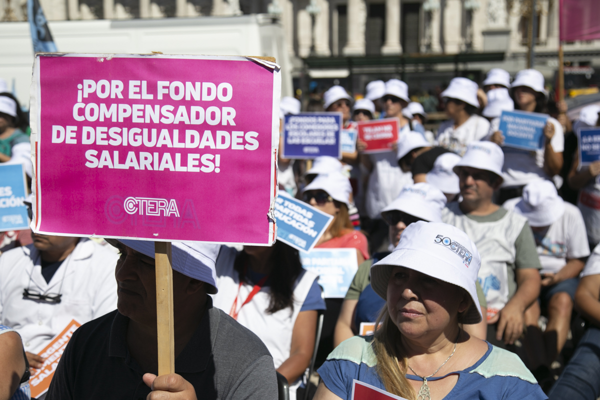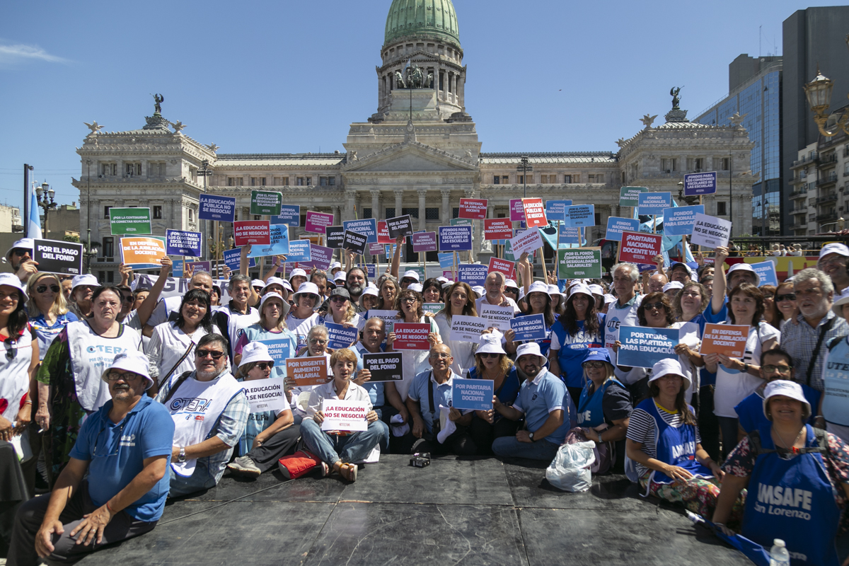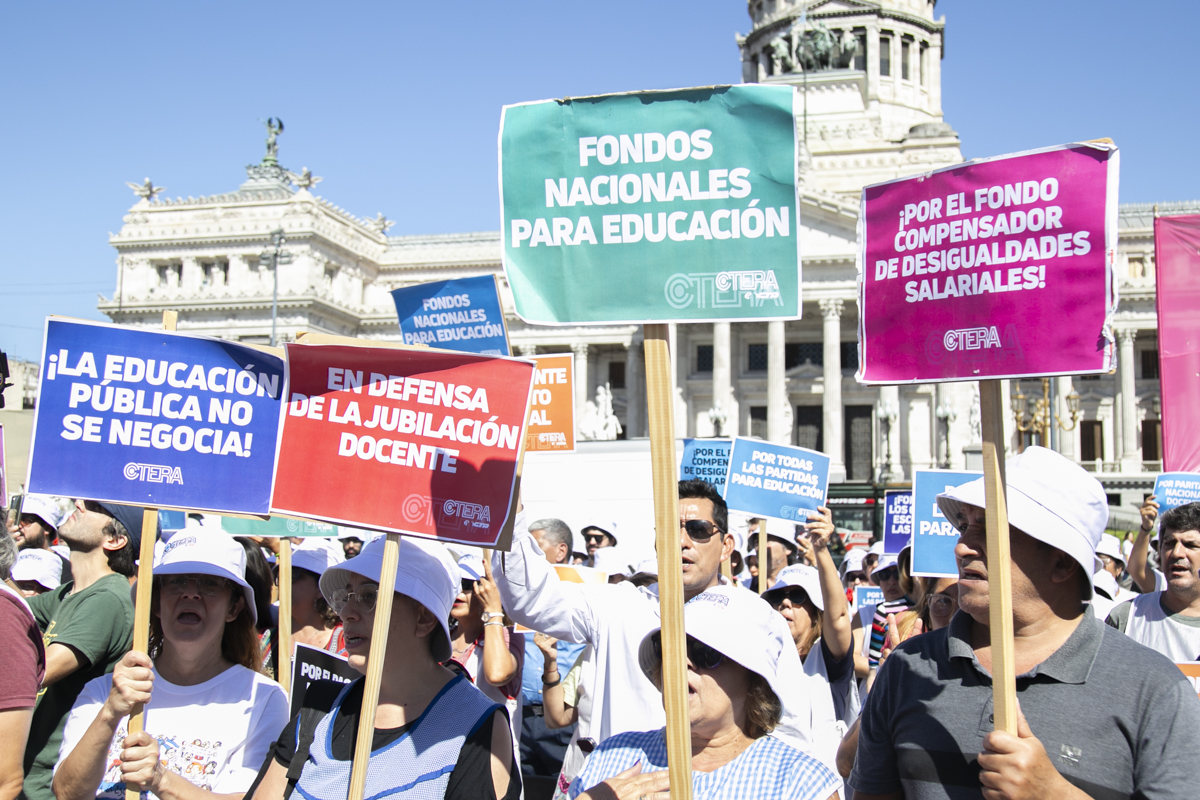 El acto central en el Congreso inició con el izamiento de la bandera acompañado con los acordes de "Aurora", reclamando en defensa de la Paritaria Nacional Docente y la jubilación docente, y por un urgente aumento salarial. Además, la CTERA exigió el pago del FONID y de los fondos para Comedores Escolares, reiterando que se garantice el financiamiento para Programas Educativos Nacionales.