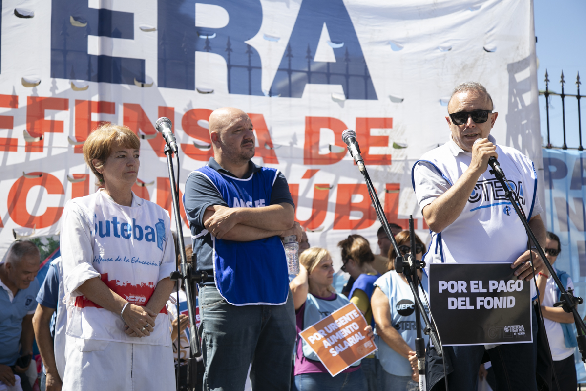 Roberto Baradel, Secretario General del SUTEBA: "Queremos el 100% de lo que le corresponde de los fondos a las provincias, esto no se negocia. Ya le dijimos al Gobierno que no firmaremos una Paritaria que no contenga al FONID. ¿Quieren discutir la esencialidad de la Educación? Discutamos en serio, a ver si la consideran esencial recortando salarios o si solo quieren amordazar el derecho de huelga".