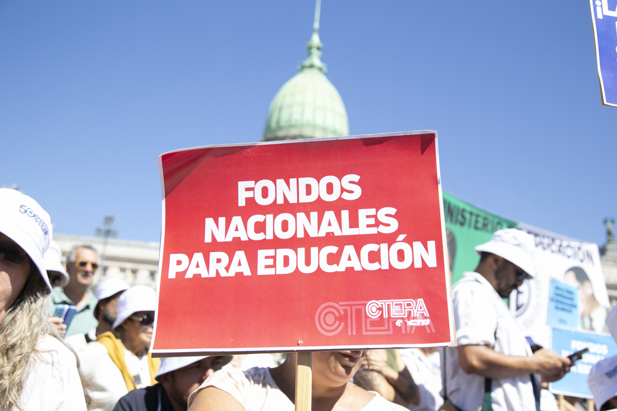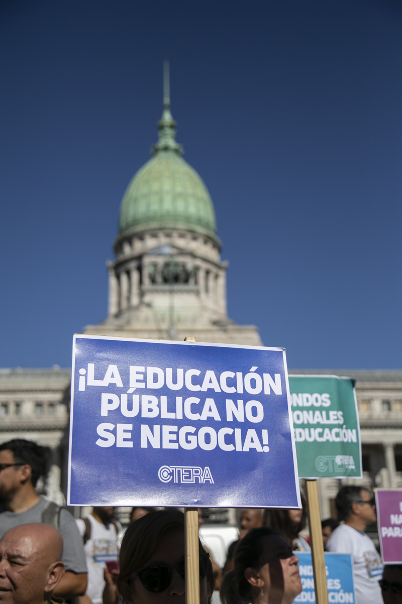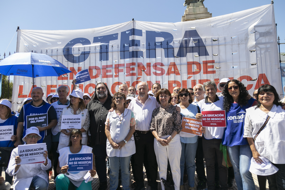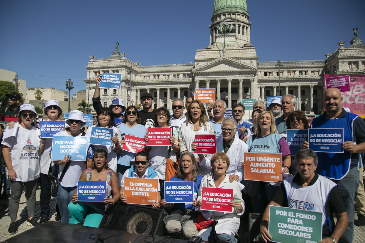 El acto central en el Congreso inició con el izamiento de la bandera acompañado con los acordes de "Aurora", reclamando en defensa de la Paritaria Nacional Docente y la jubilación docente, y por un urgente aumento salarial. Además, la CTERA exigió el pago del FONID y de los fondos para Comedores Escolares, reiterando que se garantice el financiamiento para Programas Educativos Nacionales.