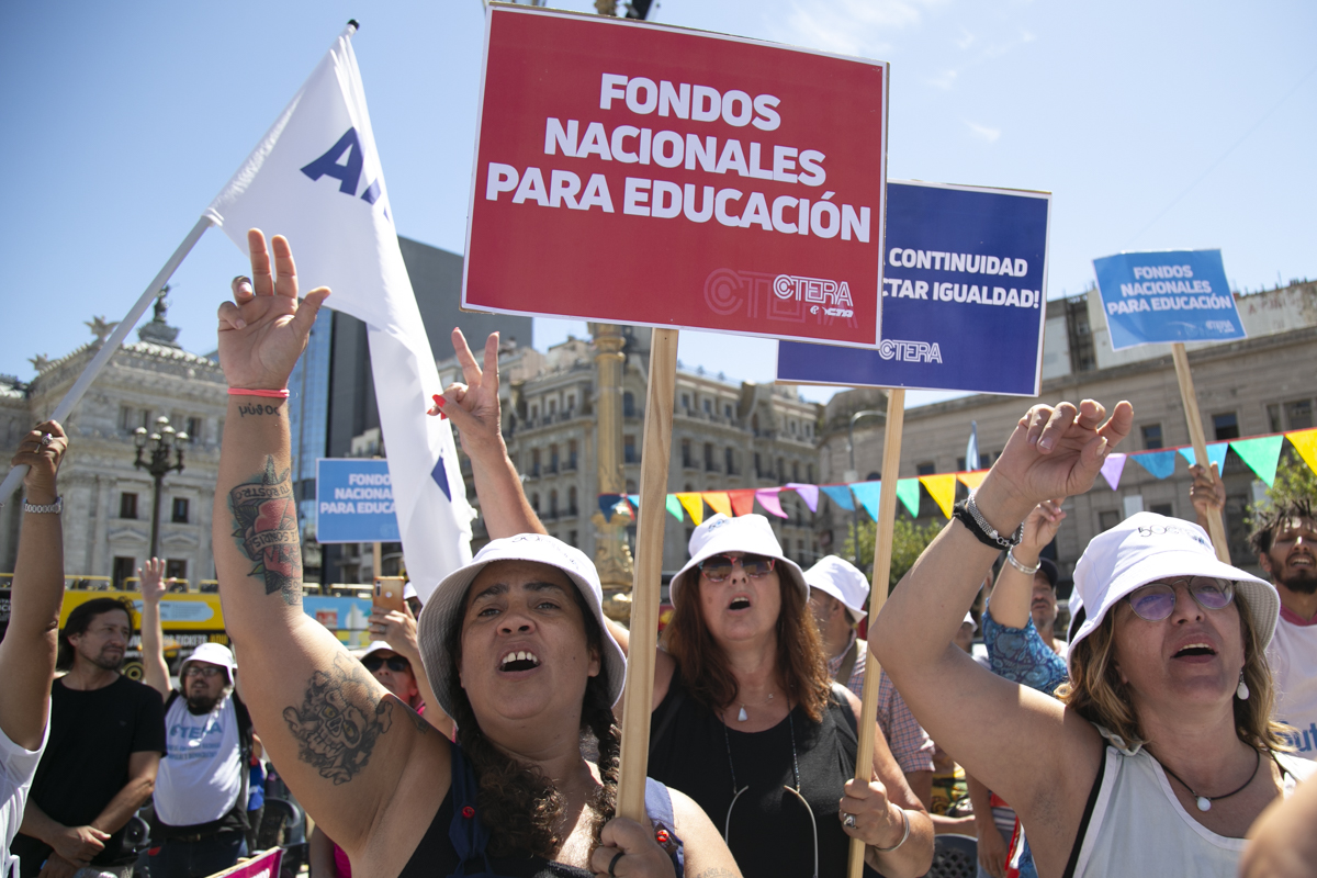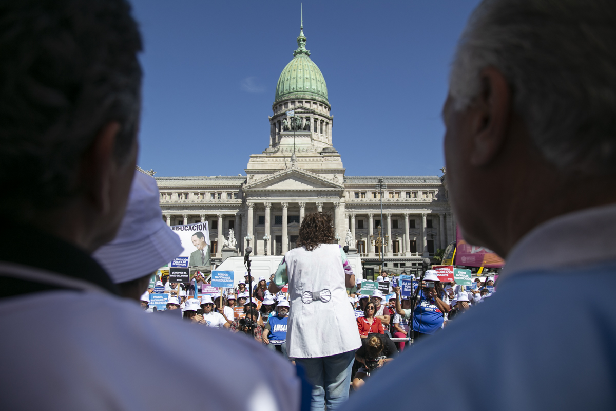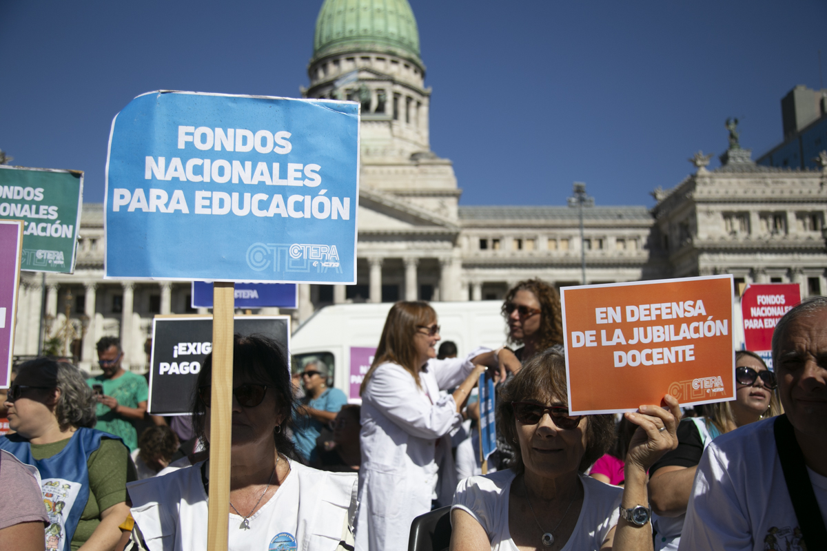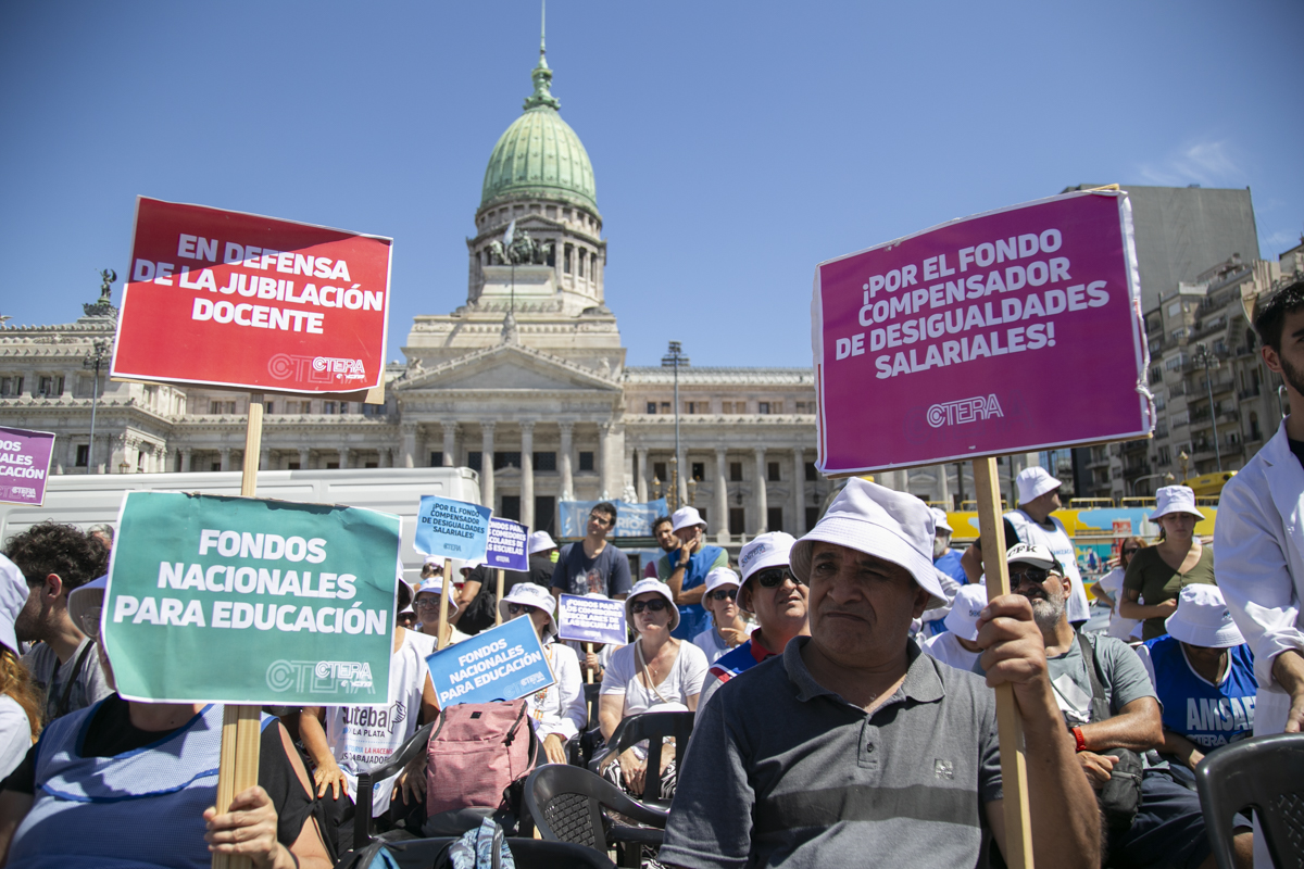 El acto central en el Congreso inició con el izamiento de la bandera acompañado con los acordes de "Aurora", reclamando en defensa de la Paritaria Nacional Docente y la jubilación docente, y por un urgente aumento salarial. Además, la CTERA exigió el pago del FONID y de los fondos para Comedores Escolares, reiterando que se garantice el financiamiento para Programas Educativos Nacionales.