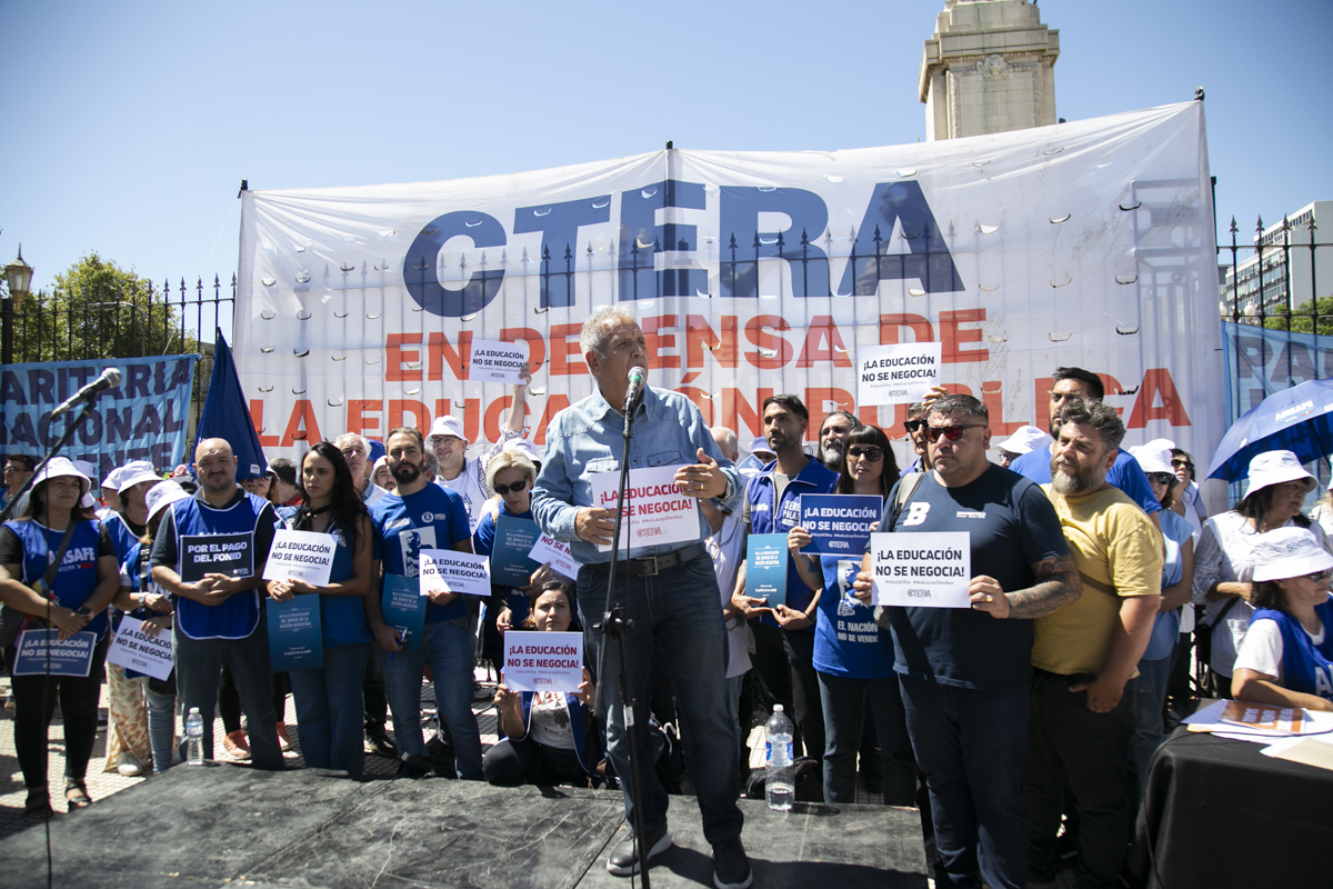 Roberto Baradel, Secretario General del SUTEBA: "Queremos el 100% de lo que le corresponde de los fondos a las provincias, esto no se negocia. Ya le dijimos al Gobierno que no firmaremos una Paritaria que no contenga al FONID. ¿Quieren discutir la esencialidad de la Educación? Discutamos en serio, a ver si la consideran esencial recortando salarios o si solo quieren amordazar el derecho de huelga".