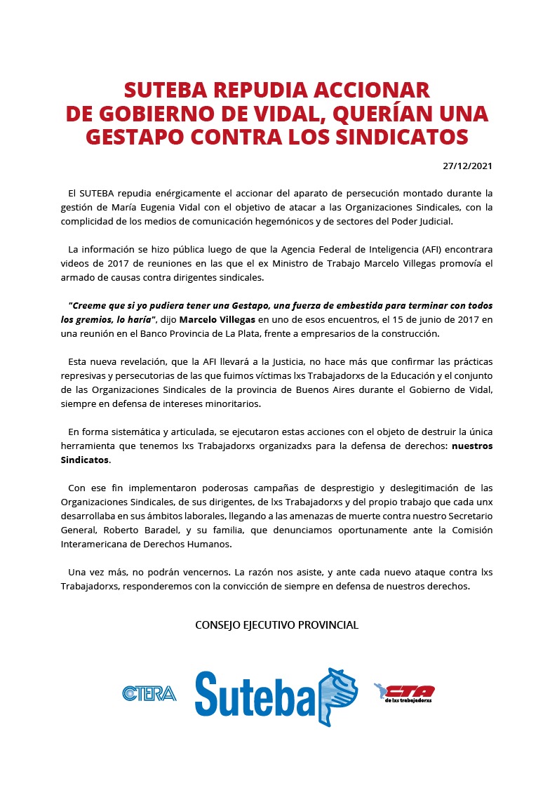 Esta nueva revelación, que la AFI llevará a la Justicia, no hace más que confirmar las prácticas represivas y persecutorias de las que fuimos víctimas lxs Trabajadorxs de la Educación y el conjunto de las Organizaciones Sindicales de la provincia de Buenos Aires durante el Gobierno de Vidal, siempre en defensa de intereses minoritarios.