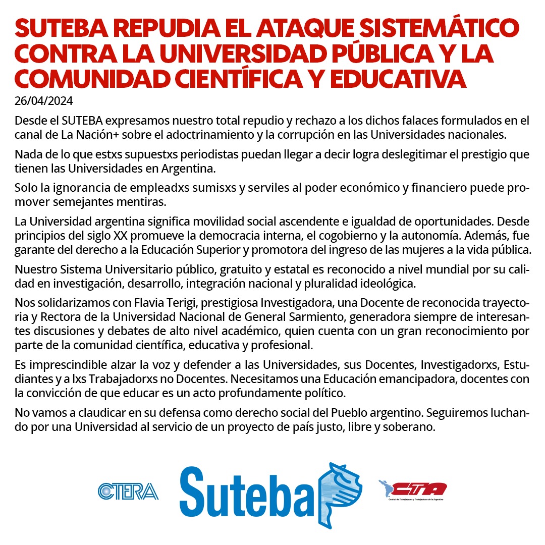 Desde el SUTEBA expresamos nuestro total repudio y rechazo a los dichos falaces formulados en el canal de La Nación+ sobre el adoctrinamiento y la corrupción en las Universidades nacionales.
