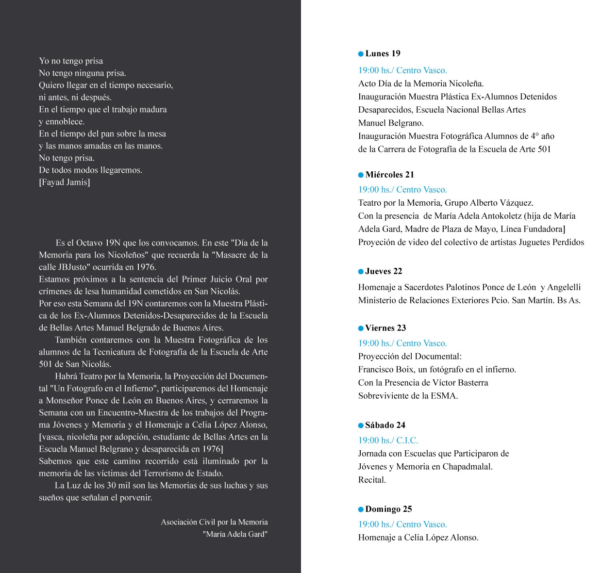 Miércoles 21 de noviembre 19 hs: "Teatro x la memoria" con el Grupo de Teatro “Alberto Vázquez” y Testimonio de María Adela Antokoletz. Madrina de la Asociación Civil “María Adela Gard”. (Madres de Plaza de Mayo Línea Fundadora). Centro Vasco de San Nicolás (Belgrano 139).