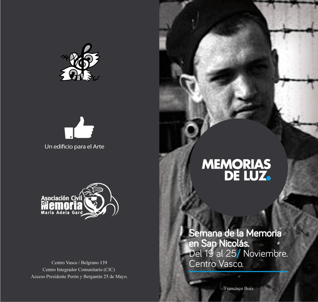 Sábado 24 de noviembre 19 hs: Jornada y muestra de los trabajos de los estudiantes del programa "Jóvenes y memoria". Recital de bandas organizado por Movimiento Evita en adhesión a la Semana de la Memoria. CIC (Centro Integrador Comunitario), Acceso Presidente Perón y Bergantín 25 de Mayo, San Nicolás.