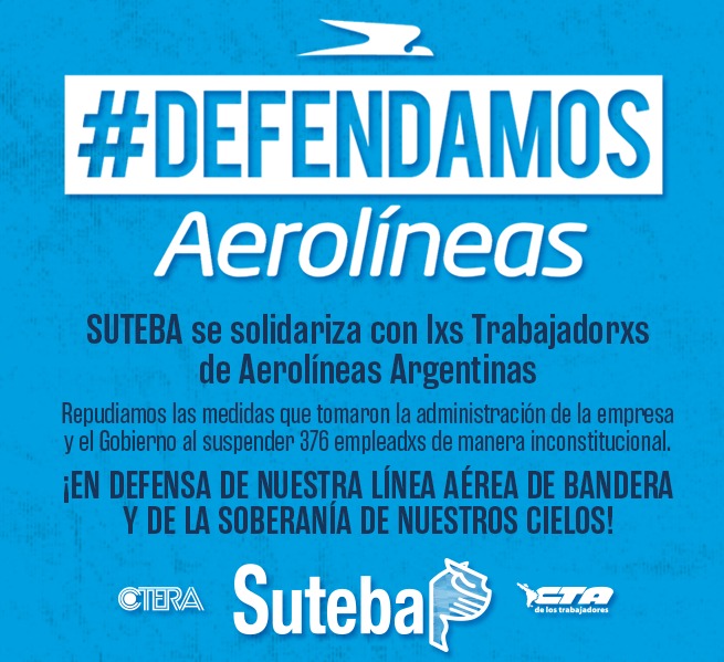 Desde SUTEBA hacemos expresa nuestra profunda solidaridad para con lxs Trabajadorxs de Aerolíneas Argentinas y repudiamos las medidas que tomaron la administración de la empresa y el Gobierno en contra de los Trabajadores y las Trabajadoras.