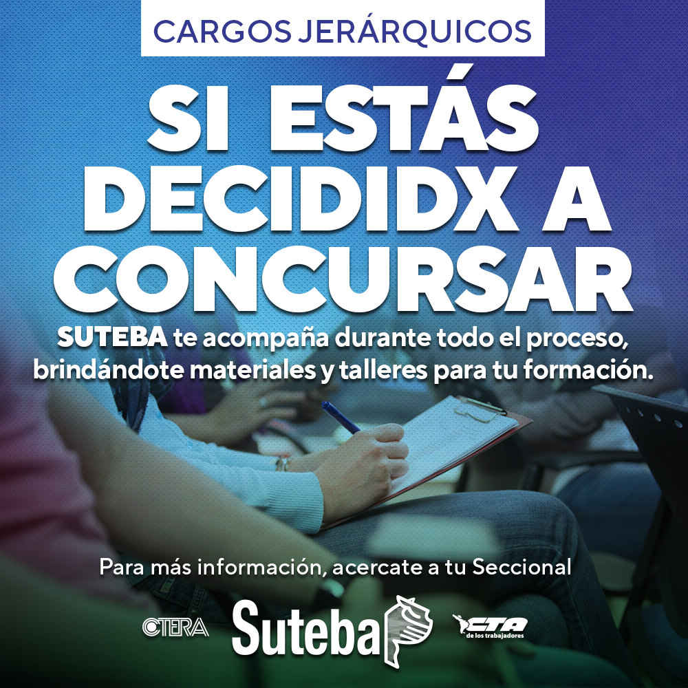 Si estás interesadx en ocupar un puesto de trabajo en la conducción institucional (Inspectorxs, Directorxs, Regentes, Jefxs de área y/o Secretarixs), desde el SUTEBA vamos a acompañarte con diferentes propuestas de formación para que logres acceder fortalecidx y con mayores herramientas a esos cargos.
