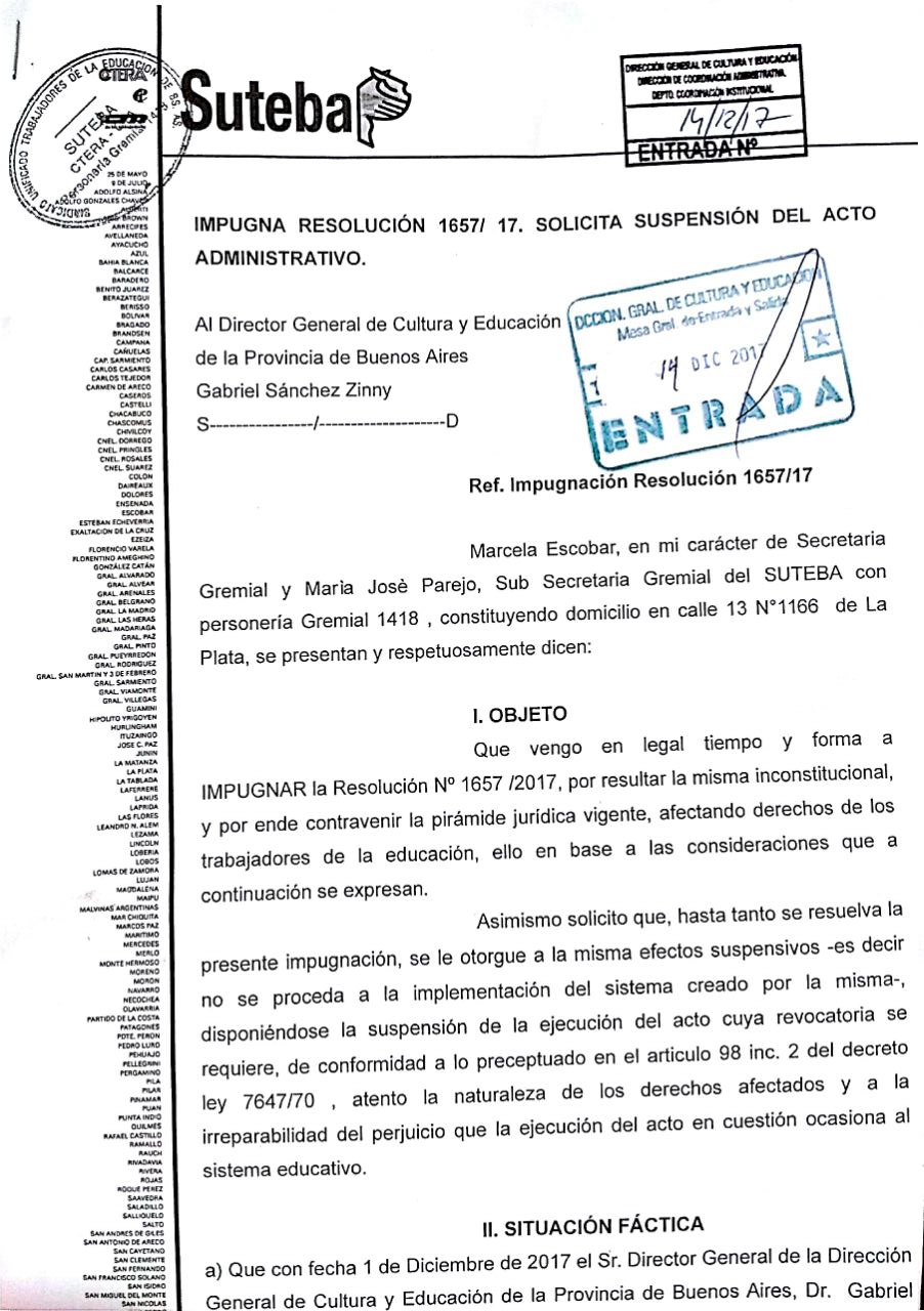 El jueves 14, el SUTEBA realizó una presentación ante la DGCyE de impugnación con efectos suspensivos a la Resolución 1657/17 que modifica la estructura organizacional de CENS, BAO (Bachilleratos de Adultos dependientes de Secundaria), BAOT (Bachilleratos de Adultos con Orientación Técnica, dependientes de Secundaria Técnica), reemplazándolos por bachilleratos juveniles, a estos últimos matriculando sólo menores de 18 años y dejando en la órbita de adultos a los CENS.