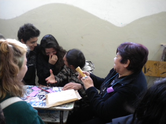 La elaboración del rompecabezas se realizó en base a preguntas que sintetizaban partes sustantivas de lo abordado en el taller, y las piezas contenían las respuestas. A medida que los interrogantes se develaban, una a una se iban colocando hasta construir entre todos la figura de un preservativo. Dicha figura fue el símbolo para instalar la segunda parte del taller que abordará el VIH/SIDA.