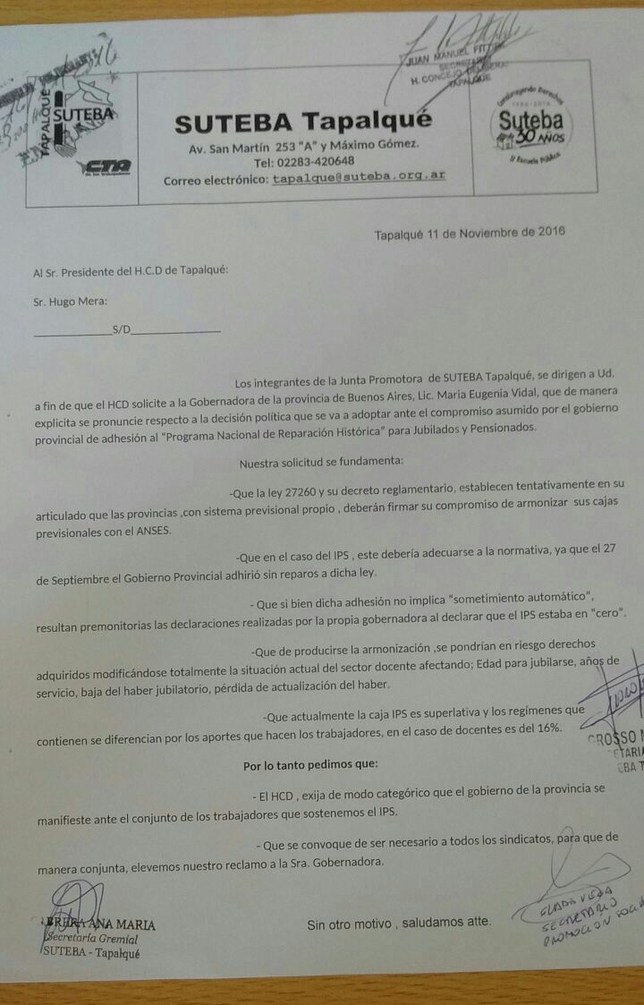 Desde el SUTEBA Tapalqué también se reclama por la jubilación de los Trabajadores de la Educación. Por eso, el día 28 de noviembre se presentó una nota al Presidente del HCD en la que se solicita que le exija a la Gobernadora María Eugenia Vidal que se expida ante la Armonización de las jubilaciones.
