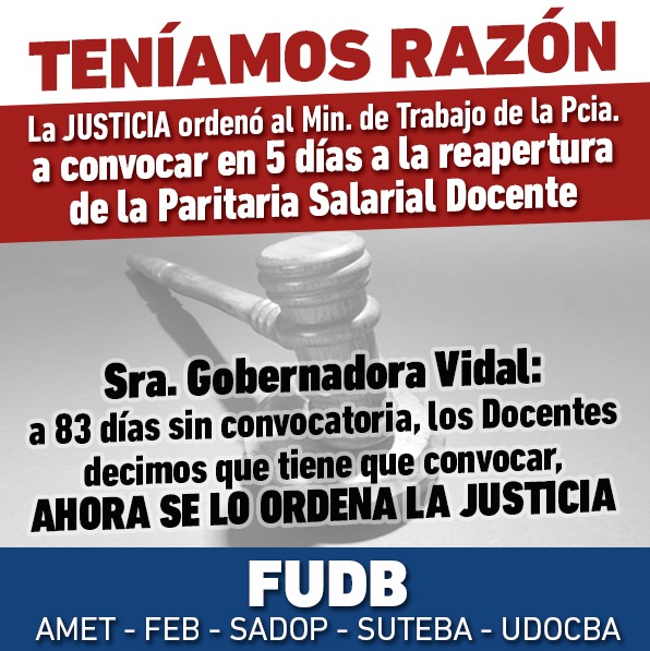 El jueves 12, en el marco de un amparo sindical presentado por el Frente de Unidad Docente Bonaerense, el Tribunal de Trabajo Nº1 de La Plata resolvió intimar al Ministerio de Trabajo de la Provincia de Buenos Aires a que convoque a Paritaria Provincial Docente, procediendo a la reapertura de la negociación sobre el ajuste salarial de lxs Trabajadorxs de la Educación en el plazo de los próximos cinco (5) días, bajo apercibimiento de disponerse la aplicación de sanciones económicas al Ministerio de Trabajo de la Provincia de Buenos Aires.