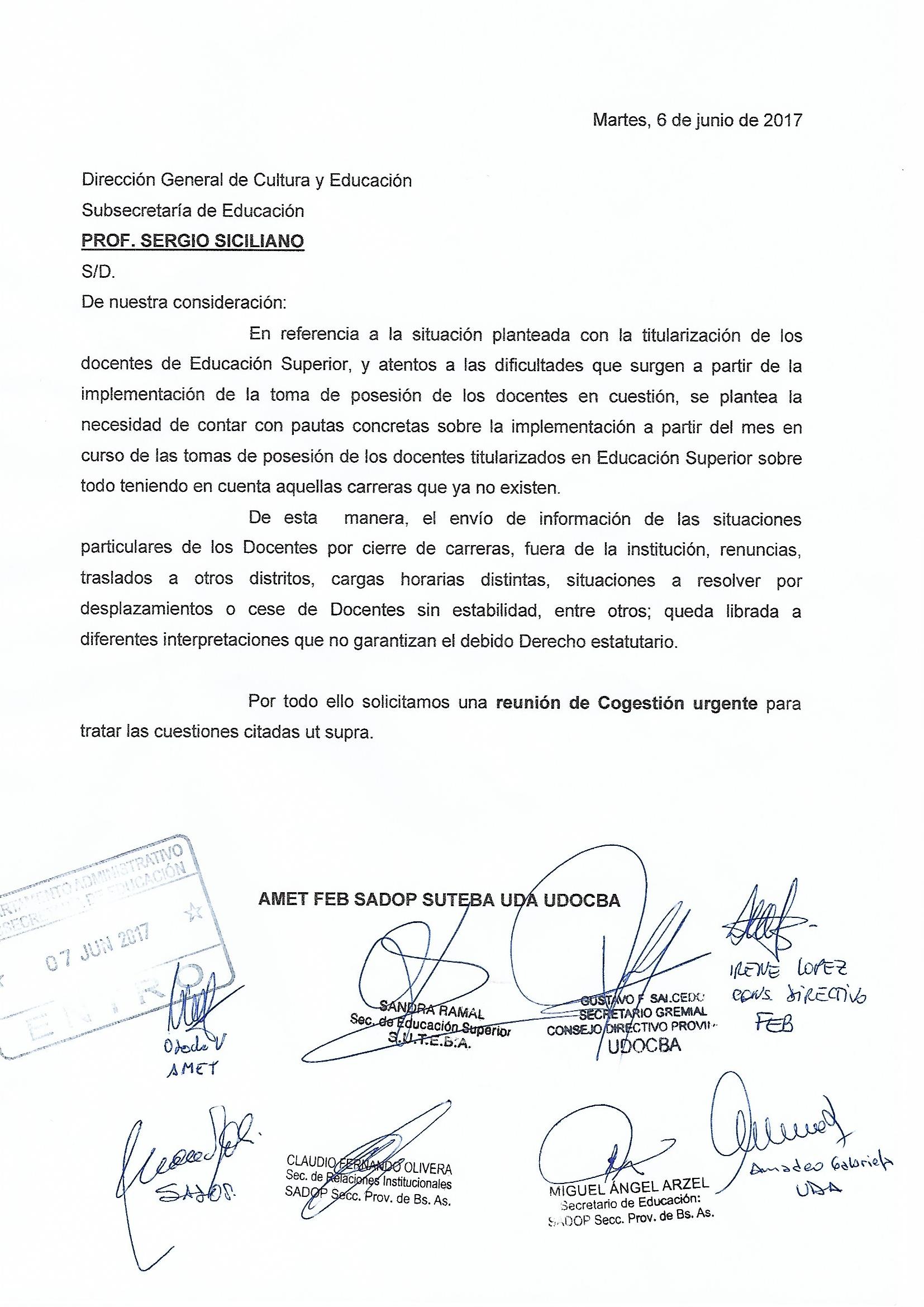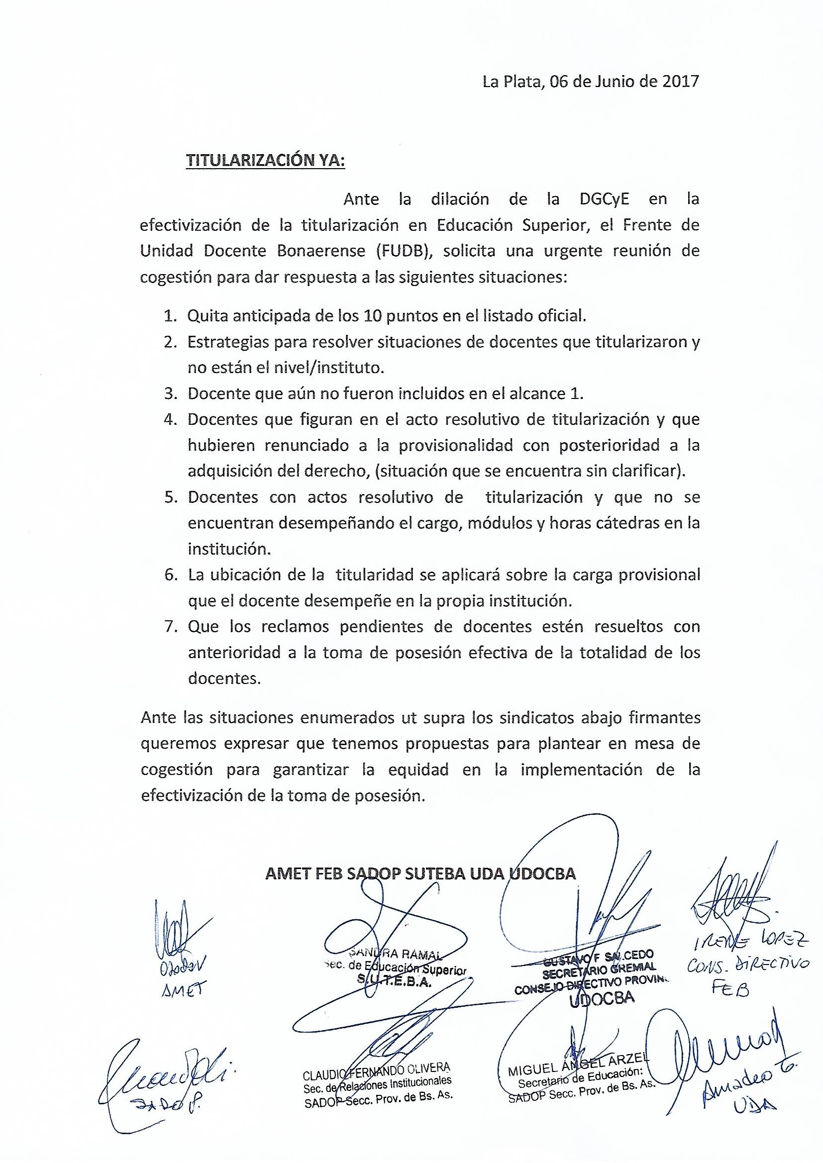 Ante la dilación de la DGCyE en la efectivización de la titularización en Educación Superior, el Frente de Unidad Docente Bonaerense (FUDB) solicita una urgente reunión de cogestión para dar respuesta a las siguientes situaciones: