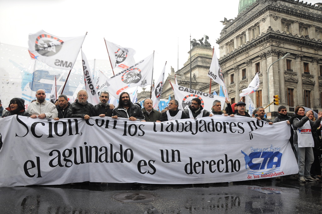 Luego, el dirigente declaró: “Exigimos que el gobierno vuelva atrás y pague el aguinaldo completo” y agregó: “Venimos a reclamar nuestro aguinaldo, pero no vamos a permitir que toquen nuestro salario.”