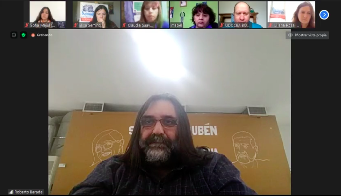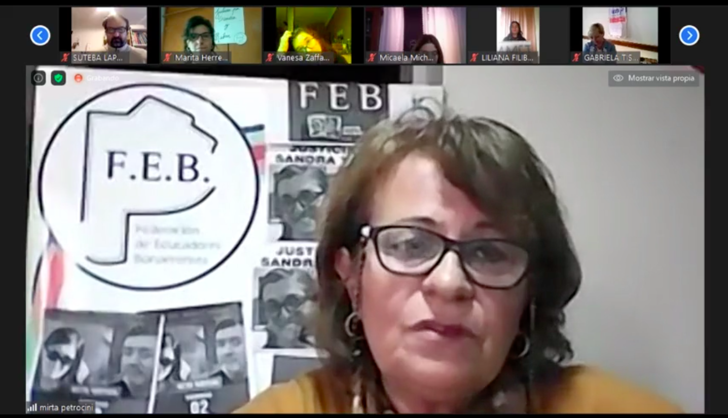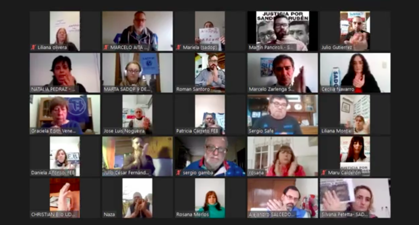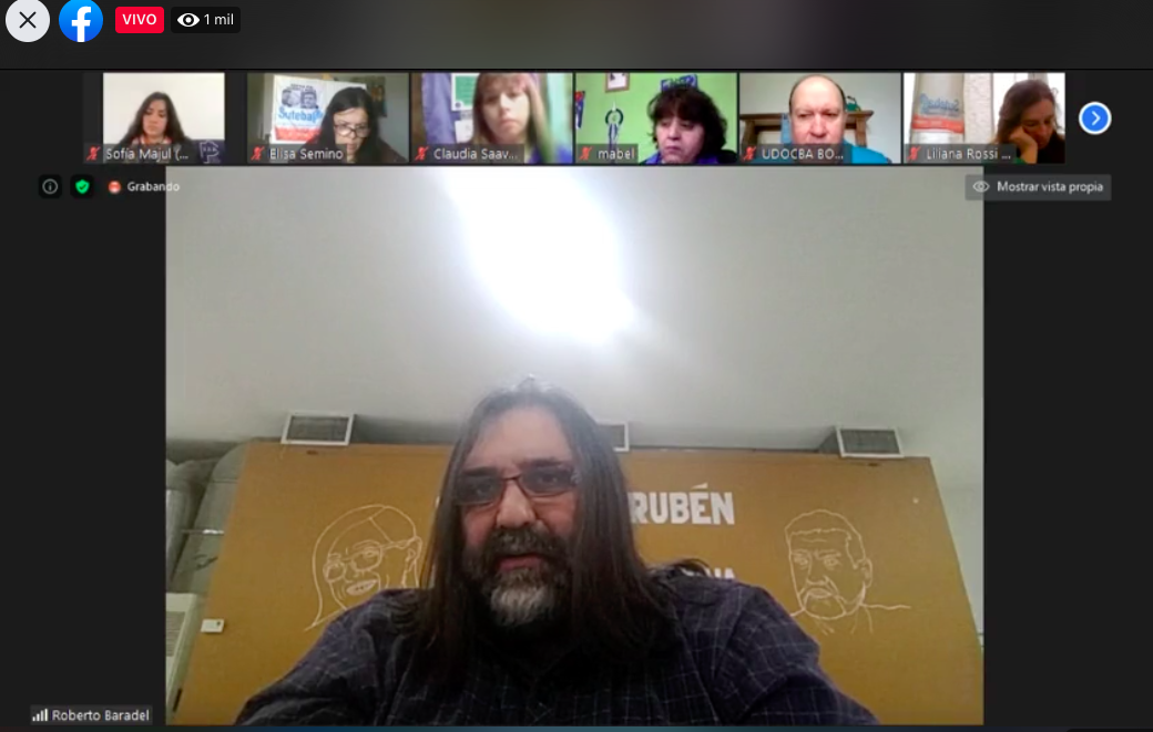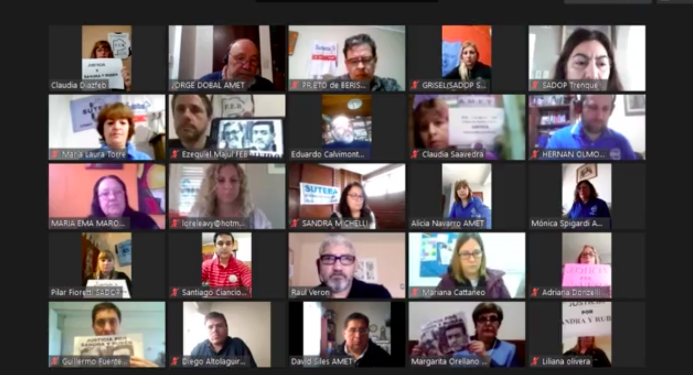 "Con gran emoción iniciamos este acto en homenaje a nuestrxs queridxs compañerxs Sandra y Rubén", expresó la Secretaria de Comunicaciones del SUTEBA, Elisa Semino, quien luego presentó a lxs participantes del encuentro virtual.