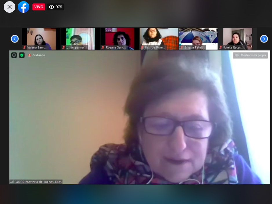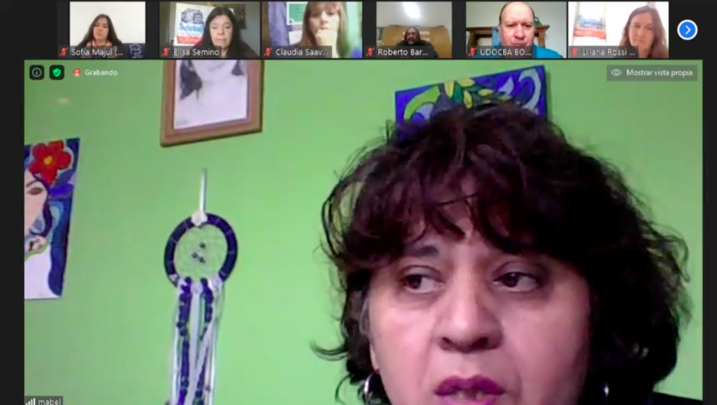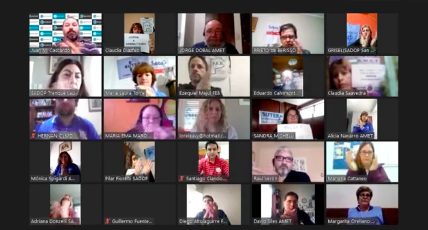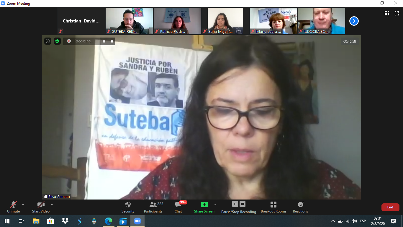 "Con gran emoción iniciamos este acto en homenaje a nuestrxs queridxs compañerxs Sandra y Rubén", expresó la Secretaria de Comunicaciones del SUTEBA, Elisa Semino, quien luego presentó a lxs participantes del encuentro virtual.