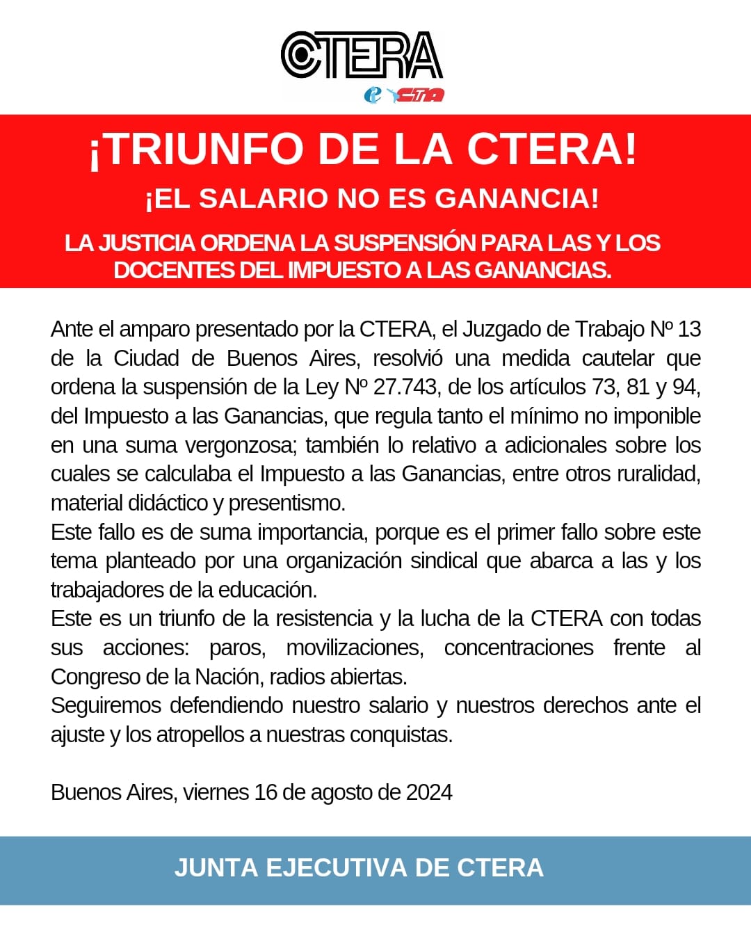 Ante el amparo presentado por la CTERA, el Juzgado de Trabajo Nº 13, de la Ciudad de Buenos Aires, resolvió una medida cautelar que ordena la suspensión de la Ley Nº 27.743, de los Artículos 73, 81 y 94, del Impuesto a las Ganancias, que regula tanto el mínimo no imponible en una suma vergonzosa; también lo relativo a adicionales sobre los cuales se calculaba el Impuesto a las Ganancias, entre otros ruralidad, material didáctico y presentismo.