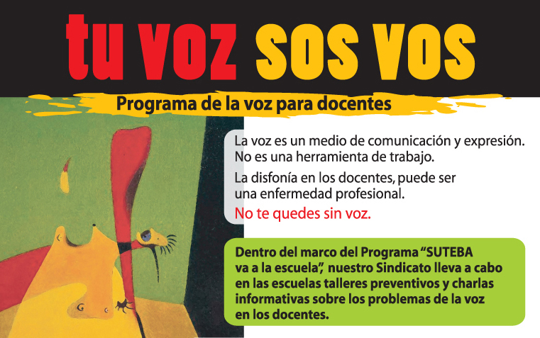 Te invitamos a participar de nuestras charlas y talleres informativos y formativos ¡NO TE QUEDES SIN VOZ! JUNTOS PODEMOS TRABAJAR PARA LOGRARL La disfonía en los docentes es una de las enfermedades reconocidas como profesionales en la Ley de Riesgos del Trabajo. La definición de enfermedad profesional implica un daño en la salud del trabajador expuesto a ciertos riesgos laborales.Por eso, desde SUTEBA continuamos desarrollando nuestra política de salud en el marco de la atención primaria, realizando tareas de promoción y prevención.Y en esta oportunidad, nuestro compromiso se traduce en la convocatoria a charlas y talleres teórico – prácticos de prevención de disfonías, que se presentarán para los docentes en las escuelas.Charla InformativaObjetivos específicos:proveer información referida a la respiración, articulación y fonaciónpromover el conocimiento de la propia voz y el cuidado de ella, favoreciendo su control periódico informar sobre las técnicas adecuadas de la voz en la actividad docente.promover actividades de prevenciónSe trabajarán las características de la voz en la docencia. Esta actividad se desarrollará con finalidad preventiva, ante la falta de formación específica de la técnica vocal en la docencia. Se presentará una breve reseña sobre: Fisiología de la fonación y de la respiración I Postura I Coordinación fonorespiratoria I -Cualidades de la voz I Recursos y/o herramientas para el uso de la voz en la escuela.Taller teórico-práctico Objetivos específicos:Acercar la adquisición del correcto esquema corporal vocal ProgramaPrevención de la fatiga vocal. Cuidado de la voz.Breve reseña del aparato respiratorio y fonatorioExplicación de la respiración costodiafragmáticaRelajación diferencialConformación del esquema corporal vocalNociones de proyección de la vozCoordinación fonorespiratoriaArticulaciónApertura vocálicaMarcación de las consonantesExpresión de la voz y de la palabraComo cualquier otro órgano, la voz forma parte del cuerpo de las personas. En los docentes, es el medio fundamental de comunicación y expresión, y está expuesta constantemente a factores personales y laborales que pueden afectarla.¿Sabías que los problemas de la voz se pueden detectar precozmente?¿Qué indicadores debemos tener en cuenta?Fatiga de la voz, que aumenta con el uso y mejora en los periodos de descanso.Carraspera.Tos seca.Tensión de los músculos del cuello, hombros y espalda.Sensación de cuerpo extraño, irritación o ardor en la garganta.Garganta reseca.Sensación de ahogo.No poder terminar una frase por falta de aire.Dificultad para hablar.Aparición y desaparición de la voz durante el día.Sonidos vocales faltantes o inaudibles.¿Cómo puedo cuidar y mejorar mi voz?Tomando agua.Limitando el consumo de alcohol y café.Dejando de fumar o disminuyendo la cantidad.No debo carraspear.Durmiendo entre 7 y 8 horas por día.No debo competir con el ruido ambiental.La disfonía crónica en los docentes es una enfermedad profesional cubierta por la Ley de Riesgos del Trabajo (LRT Nº 24557) y debe encuadrarse por el Art. 114 A3 del Estatuto del Docente. Ante el primer síntoma debes consultar a un médico y de confirmarse el diagnóstico, realizar la denuncia ante la ART. Ante cualquier consulta que desees realizar, no dudes en ponerte en contacto con la Seccional de SUTEBA de tu distrito.
