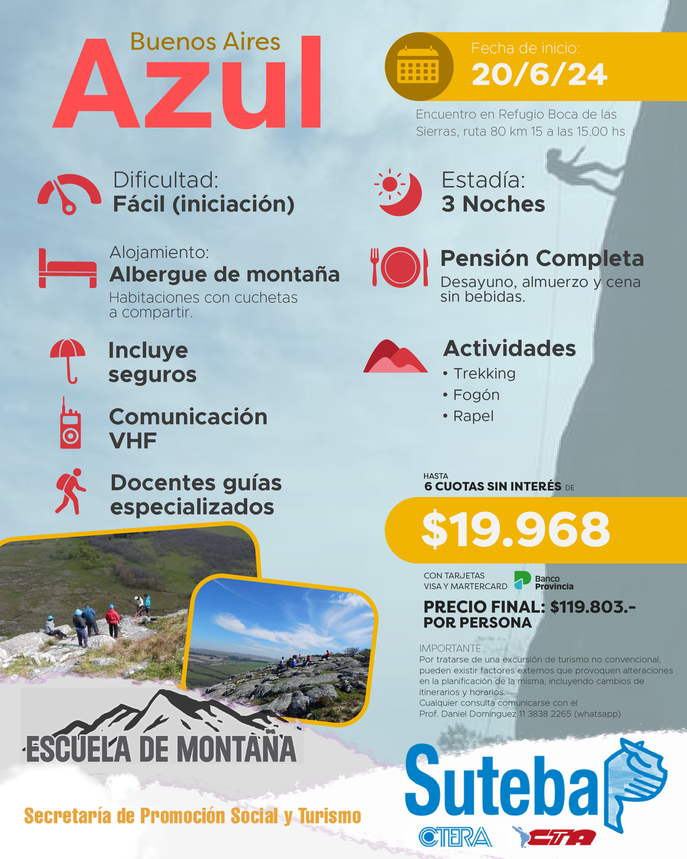 La Escuela de Montaña del SUTEBA volvió a hacer una salida en las Sierras de Azul, donde, más allá del tiempo feo, logró todos los objetivos planteados con lxs afiliadxs que participaron del contingente.