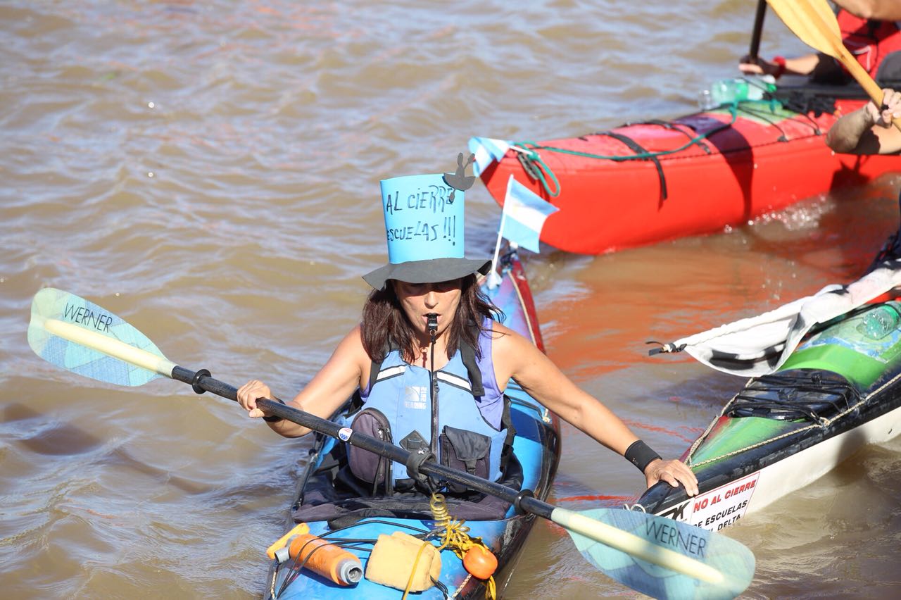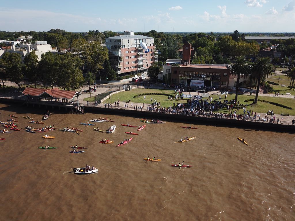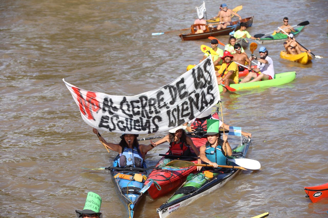 Luego, todxs juntxs cruzamos con lxs kayakistas desde el Recreo al acto en el Paseo Victorica, mientras que ellxs lo presenciaron flotando en el agua. En el acto finalmente confluimos con todxs aquellxs que se movilizaron por tierra desde la Estación Fluvial, en un acto inmenso de fortaleza y acompañamiento a la Escuela Pública que será un capítulo más para agregar a nuestra historia de lucha, porque marchamos por el río junto a lxs kayakistas que le regalaron a la escuela de arroyo Caracoles una bandera que sintetiza toda esta lucha con la frase "Un río de lucha".