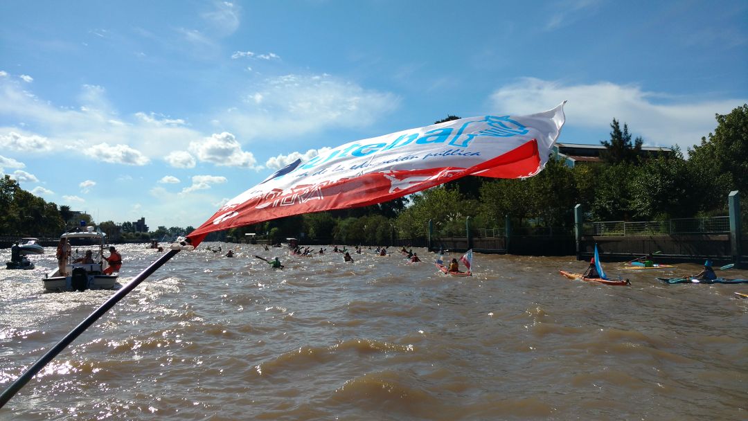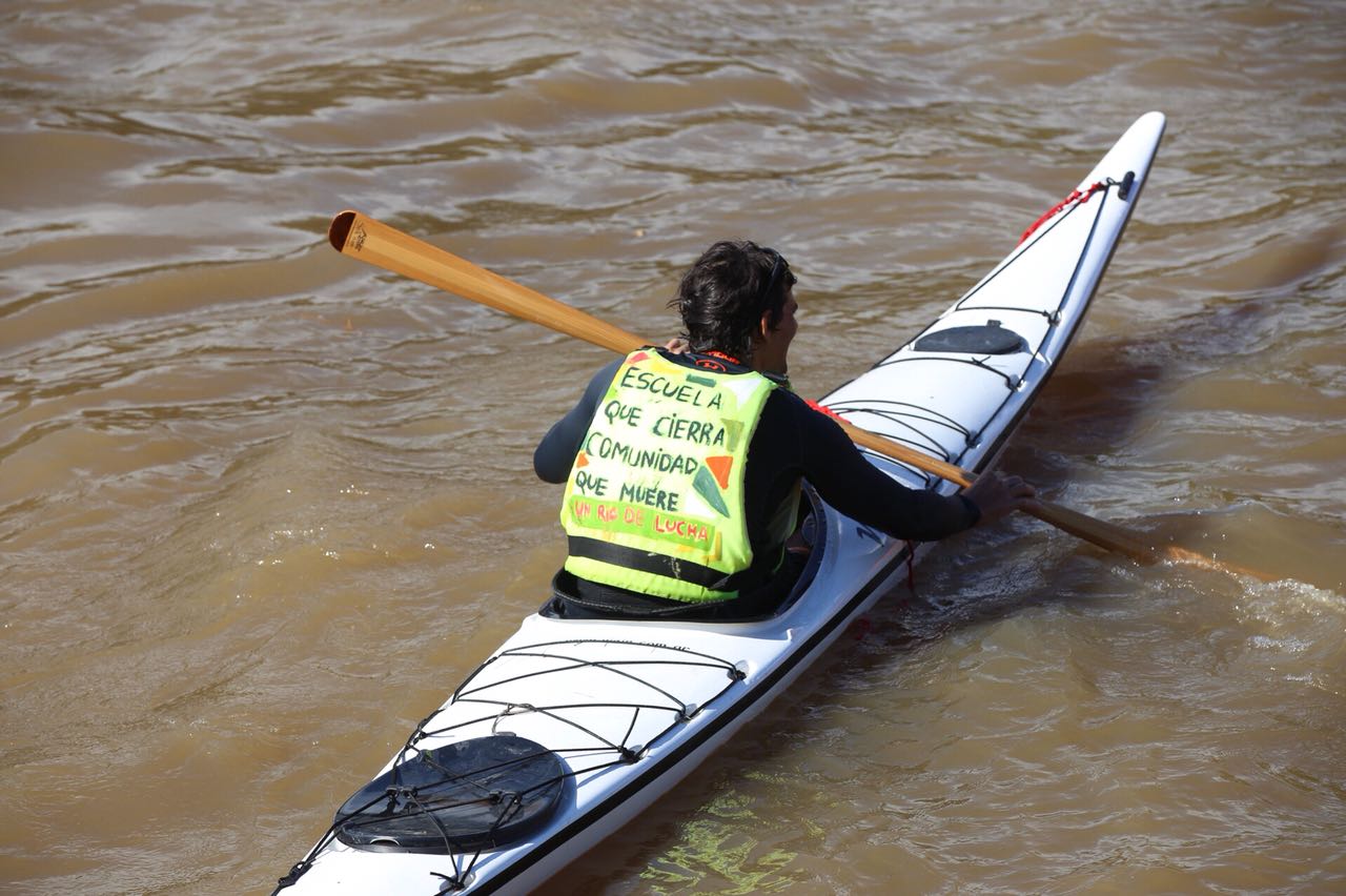 Luego, todxs juntxs cruzamos con lxs kayakistas desde el Recreo al acto en el Paseo Victorica, mientras que ellxs lo presenciaron flotando en el agua. En el acto finalmente confluimos con todxs aquellxs que se movilizaron por tierra desde la Estación Fluvial, en un acto inmenso de fortaleza y acompañamiento a la Escuela Pública que será un capítulo más para agregar a nuestra historia de lucha, porque marchamos por el río junto a lxs kayakistas que le regalaron a la escuela de arroyo Caracoles una bandera que sintetiza toda esta lucha con la frase "Un río de lucha".