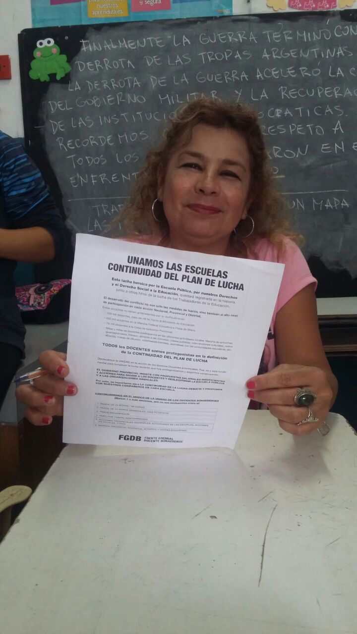 Porque estamos firmes y unidos ante el intento del Gobierno de María Eugenia Vidal de desprestigiar la tarea docente, la Escuela Pública y a las organizaciones sindicales, además de presentar propuestas salariales que resultan más que insuficientes frente a una realidad que habla de ajuste y pobreza, y porque creemos convincentemente que la unidad democrática es el camino para salir de esta encrucijada, apostamos más que nunca a la voluntad de cada uno de los y las docentes de los distritos de nuestra provincia.