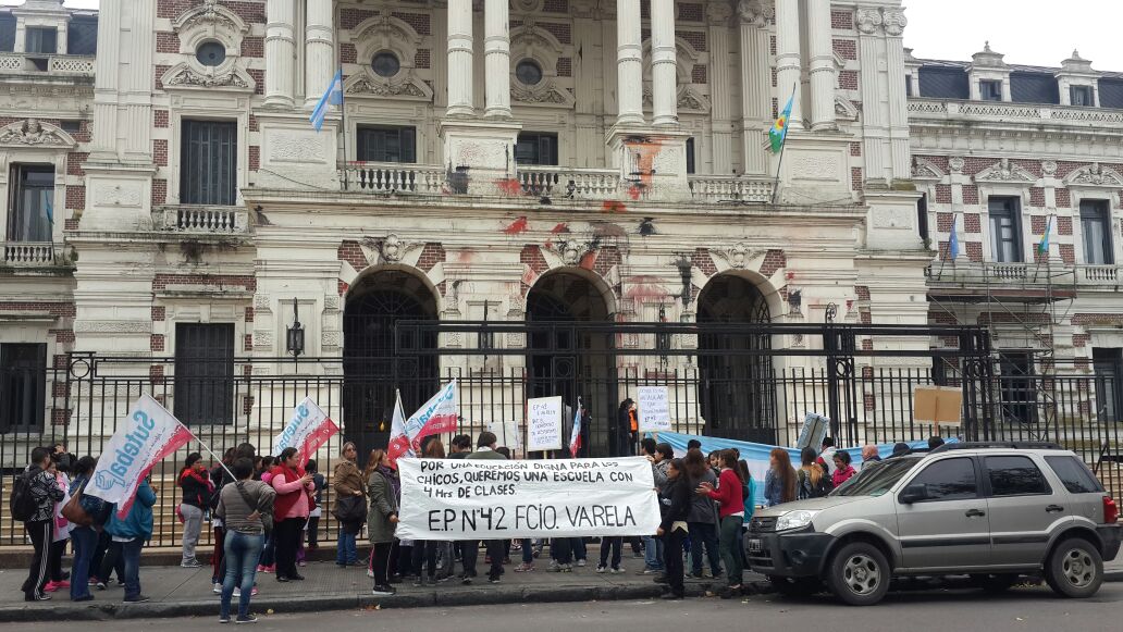 El SUTEBA Florencio Varela encabezó este lunes el reclamo de los docentes, padres y alumnos de la EP Nº42, que protestaron frente a la Gobernación bonaerense, en La Plata, ante el incumplimiento del Gobierno provincial en la instalación de aulas modulares que permitan el desarrollo de las clases mientras se construye el nuevo edificio de la Institución.
