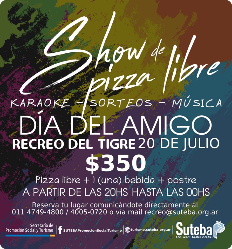 Se realizará un divertido Show de pizza libre, con karaoke, sorteos y música. Reservá tu lugar comunicándote directamente al 01147494800 o vía email al recreo@suteba.org.ar.