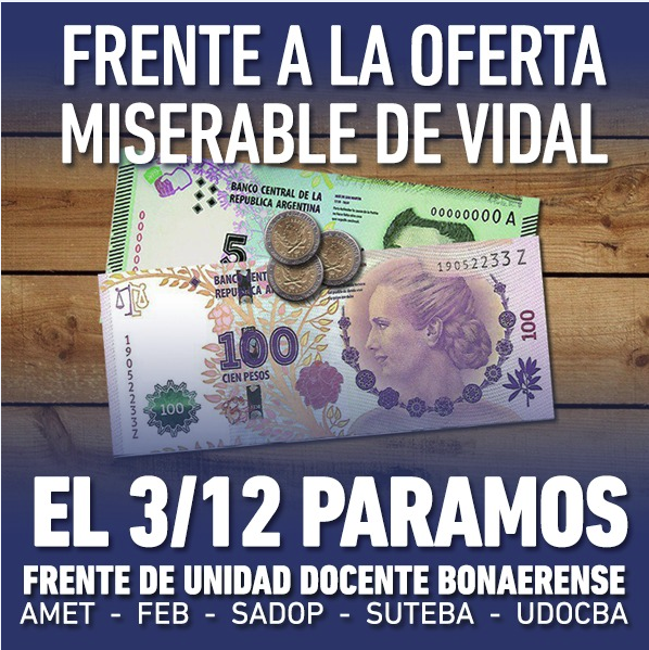 Ante esta situación, este Frente continuará el Plan de Lucha con un PARO PROVINCIAL DOCENTE el próximo lunes 3 de diciembre.