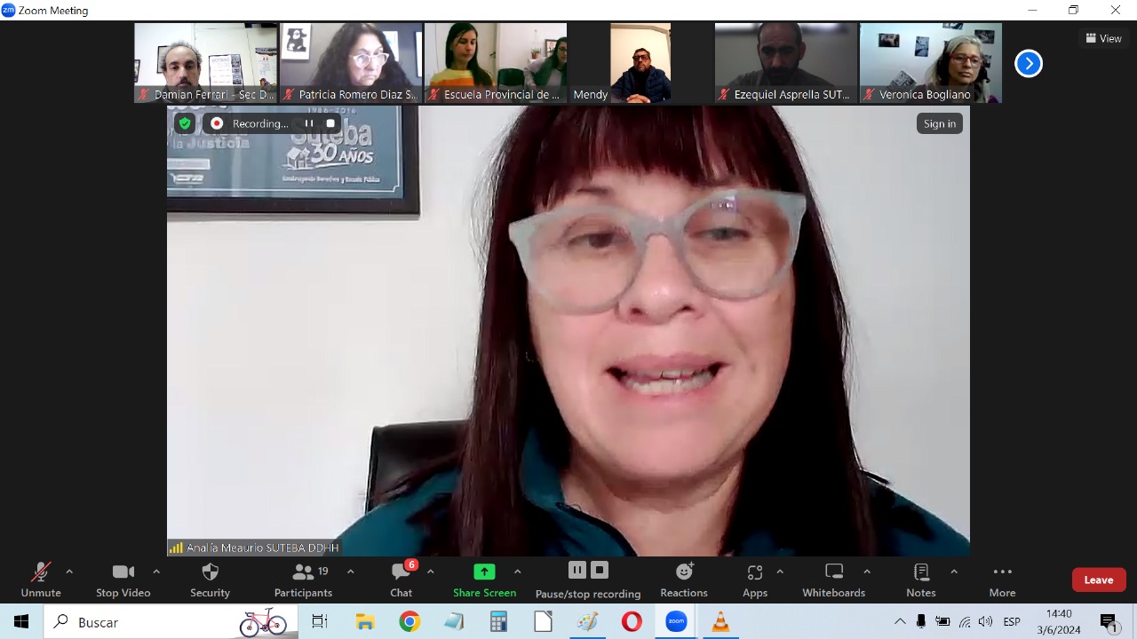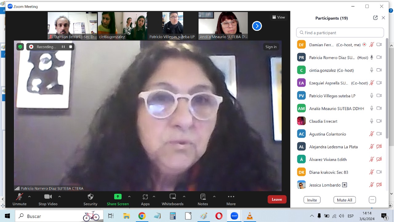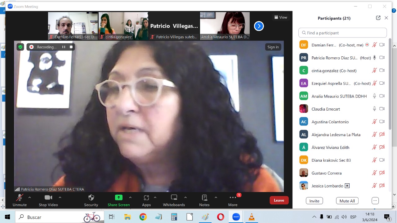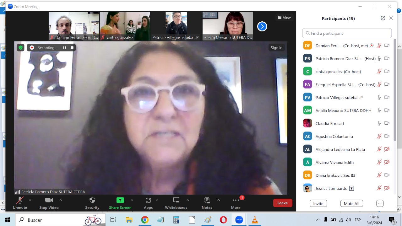 A su vez, Patricia Romero Díaz, Secretaria de DDHH del SUTEBA Provincia, recordó la vida de lucha y enseñanzas de Norita Cortiñas, Madre de Plaza de Mayo, y recibió a lxs Docentes señalando la historia de este Programa que se inscribe en las políticas de Memoria, Verdad y Justicia, que son constitutivas e identitarias para el SUTEBA en tanto consideramos que la Escuela Pública construye Memoria para transmitirla a las nuevas generaciones.