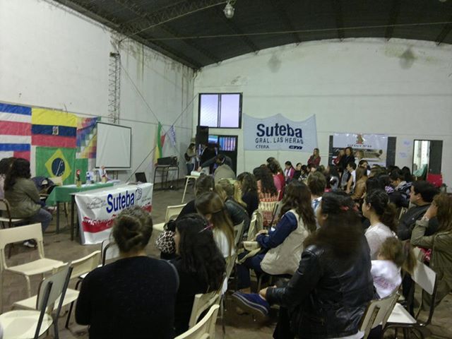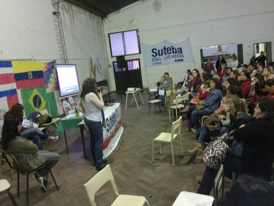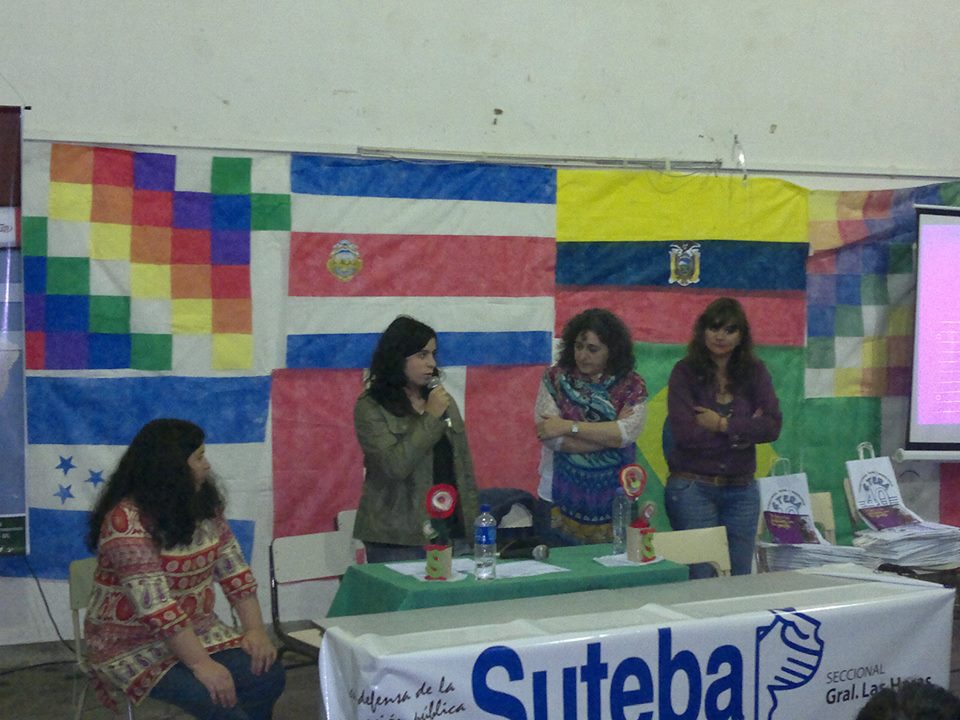 El SUTEBA, invitado por la carrera de Trabajo Social y las autoridades del Instituto Superior N°44, realizó la presentación en el Gimnasio del Instituto. Patricia Martínez, Secretaria General SUTEBA General Las Heras, y por Florencia Rodríguez, licenciada en Trabajo Social y Secretaria de Cultura y DDHH SUTEBA General Las Heras, fueron las encargadas de presentar al panel expositor, conformado por Marina Mapelli, coordinadora y compiladora de la publicación del libro y Secretaria de Jubilaciones SUTEBA Provincial; y por Adriana Taboada, integrante del Centro de Estudio sobre Genocidio de la Universidad Nacional de Tres de Febrero y miembro de la Comisión por la Memoria, la Verdad y la Justicia Zona Norte.